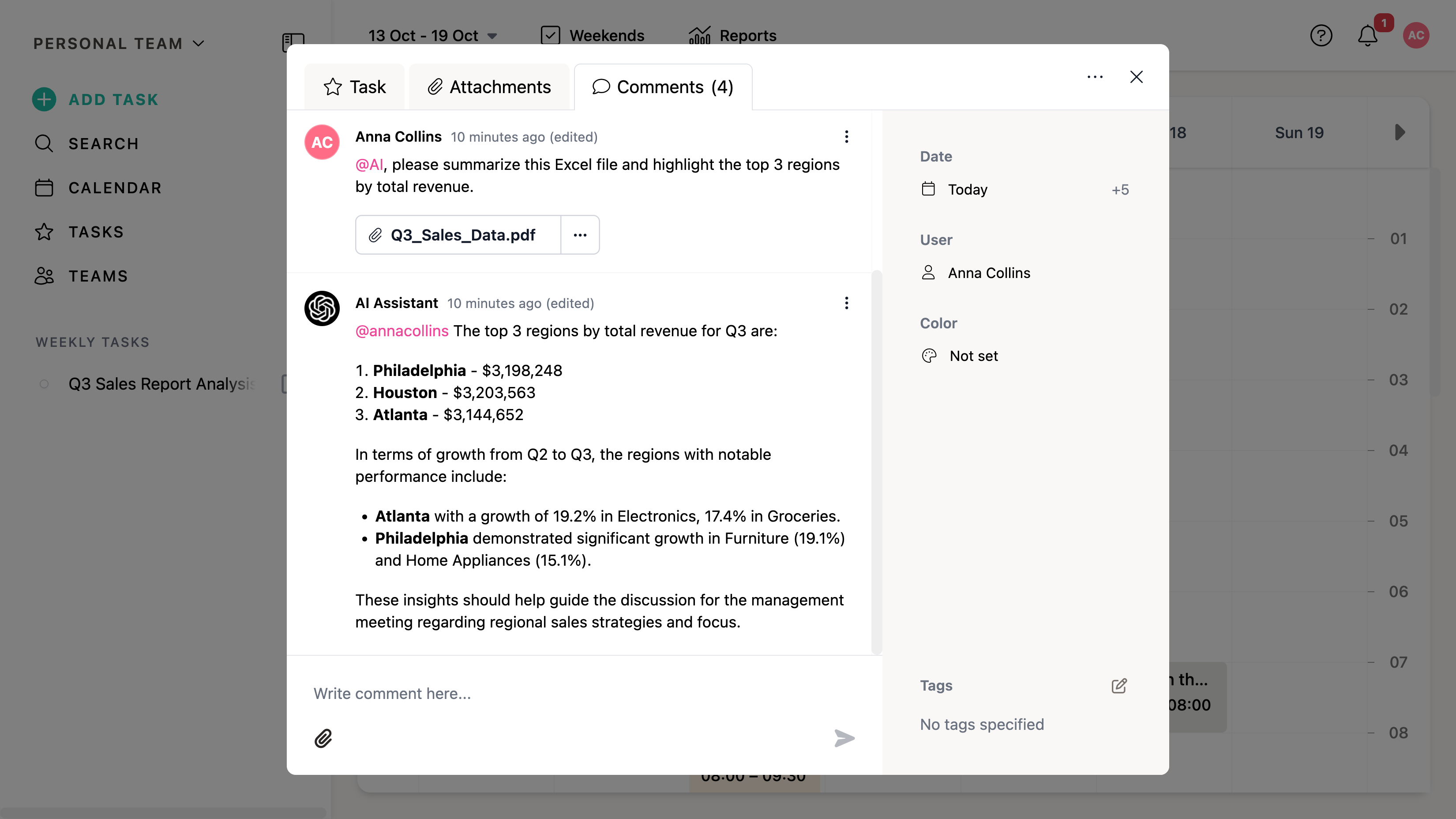 The built-in AI Assistant helps you work smarter and faster. It understands your tasks — including titles, descriptions, comments, and files — and provides meaningful insights, summaries, or answers right where you need them.