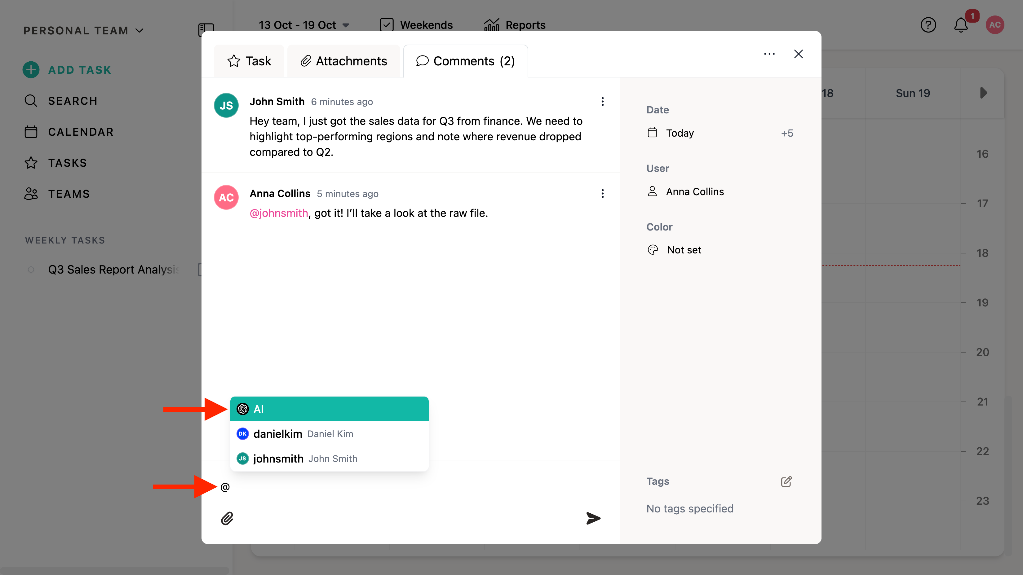 To address your message to the AI, you need to tag it in the comments. In the comment input field type @ and popup appears which shows all team members including AI Assistant at the very top. Tag AI Assistant by pressing Enter or click on it.