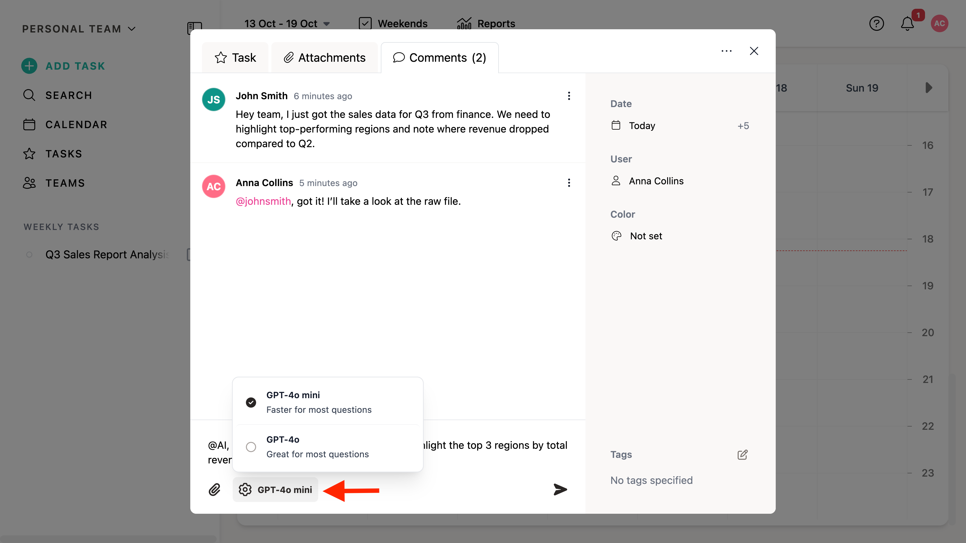 Before sending your message to AI, you can choose the AI model. There are several AI models available such as GPT-4o, GPT-4o mini, etc. Switch between models using the button below the comment input field.