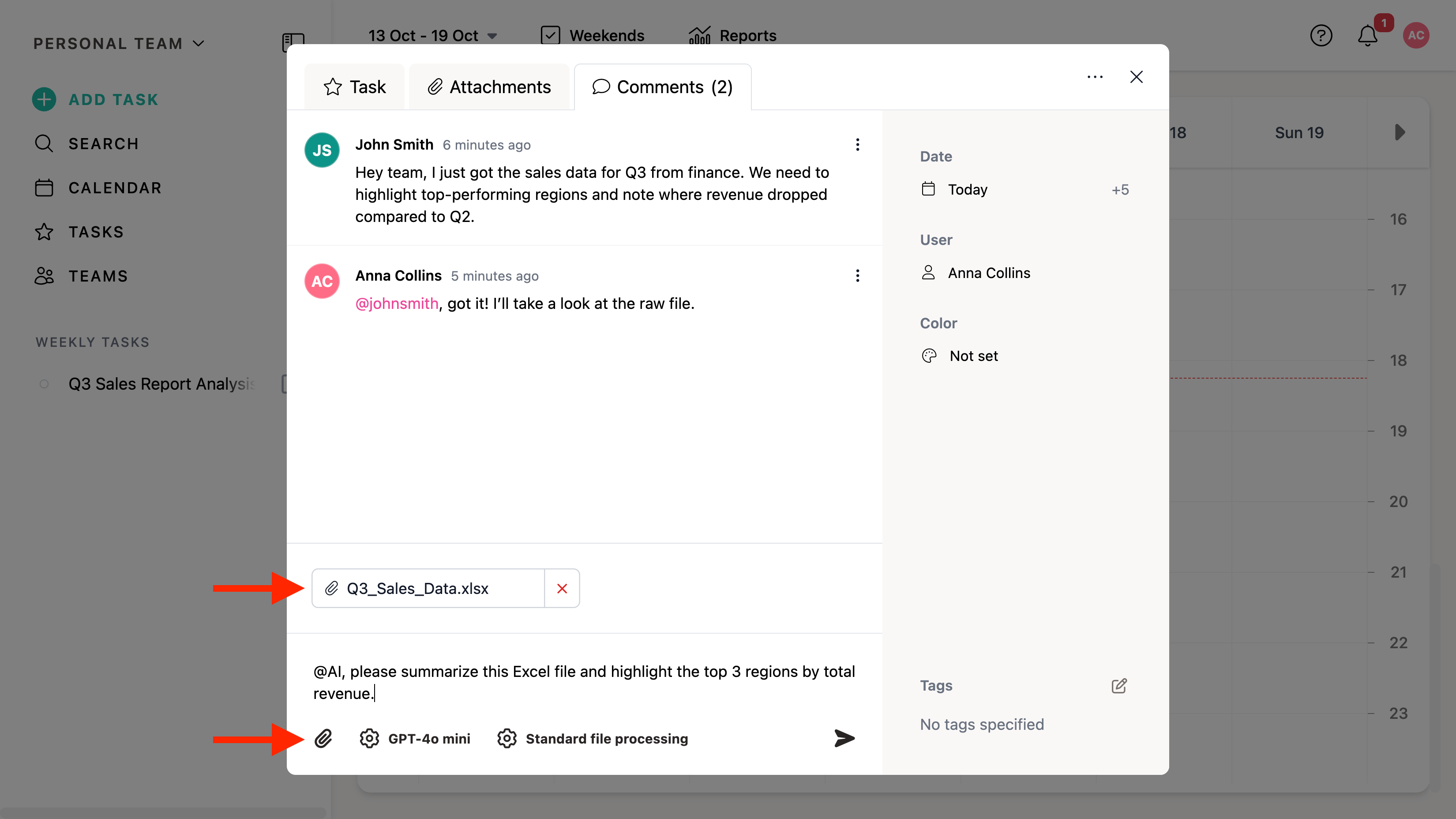 Itimist has built-in AI Assistant that can help you solve your tasks faster. AI understands your entire task — from its title and description to its comments and attached files — and responds with insights that match the real context.
