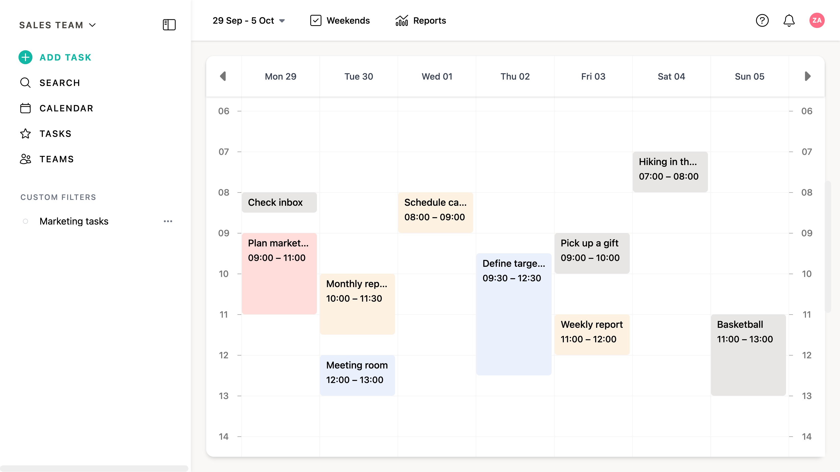 The Calendar helps you plan and visualize your time. Create and manage activities, track progress, and generate reports to analyze productivity. Everything stays connected to your tasks and teams.