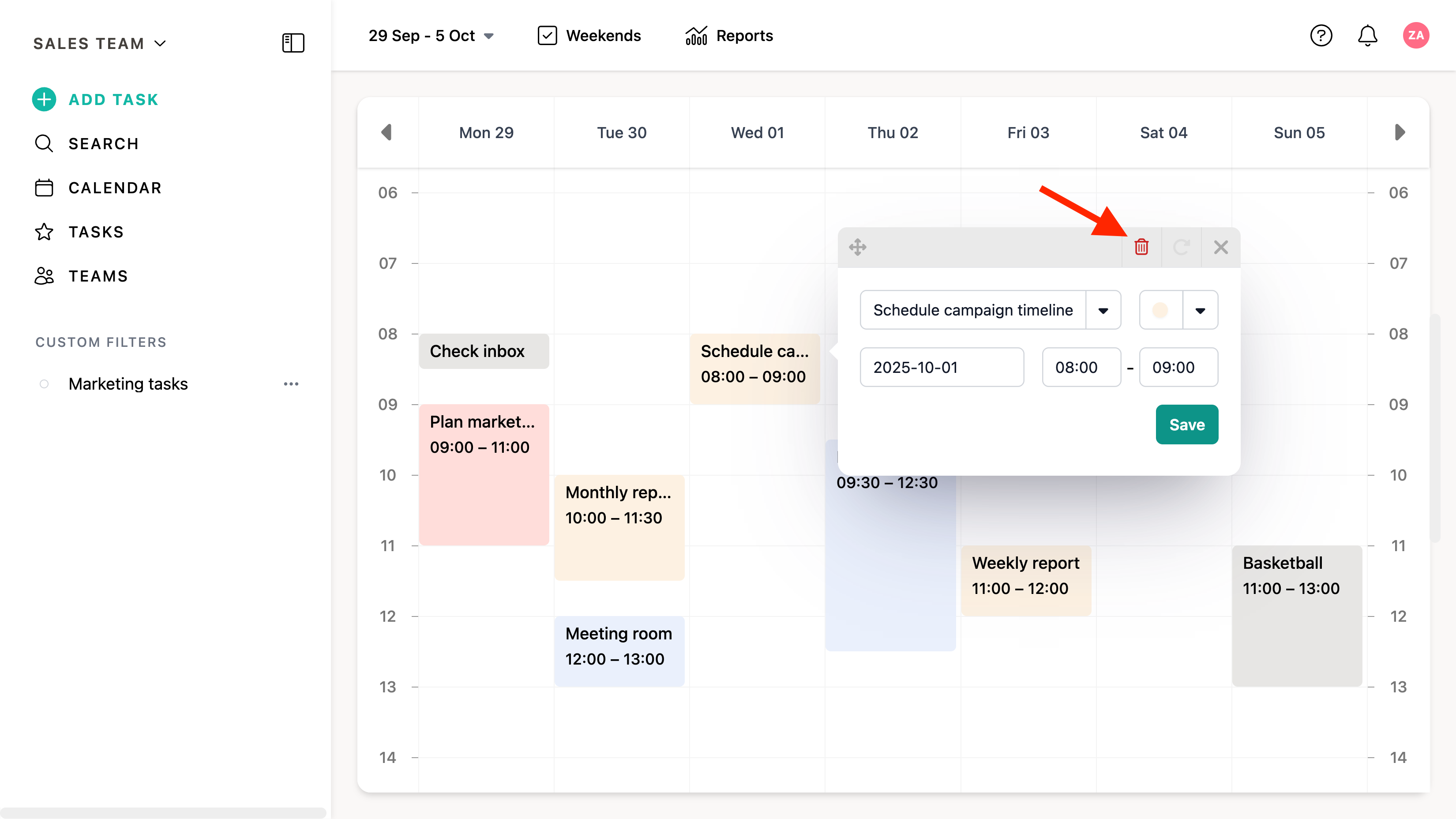 In the popup, click the trash icon in the top-right corner to remove the activity.