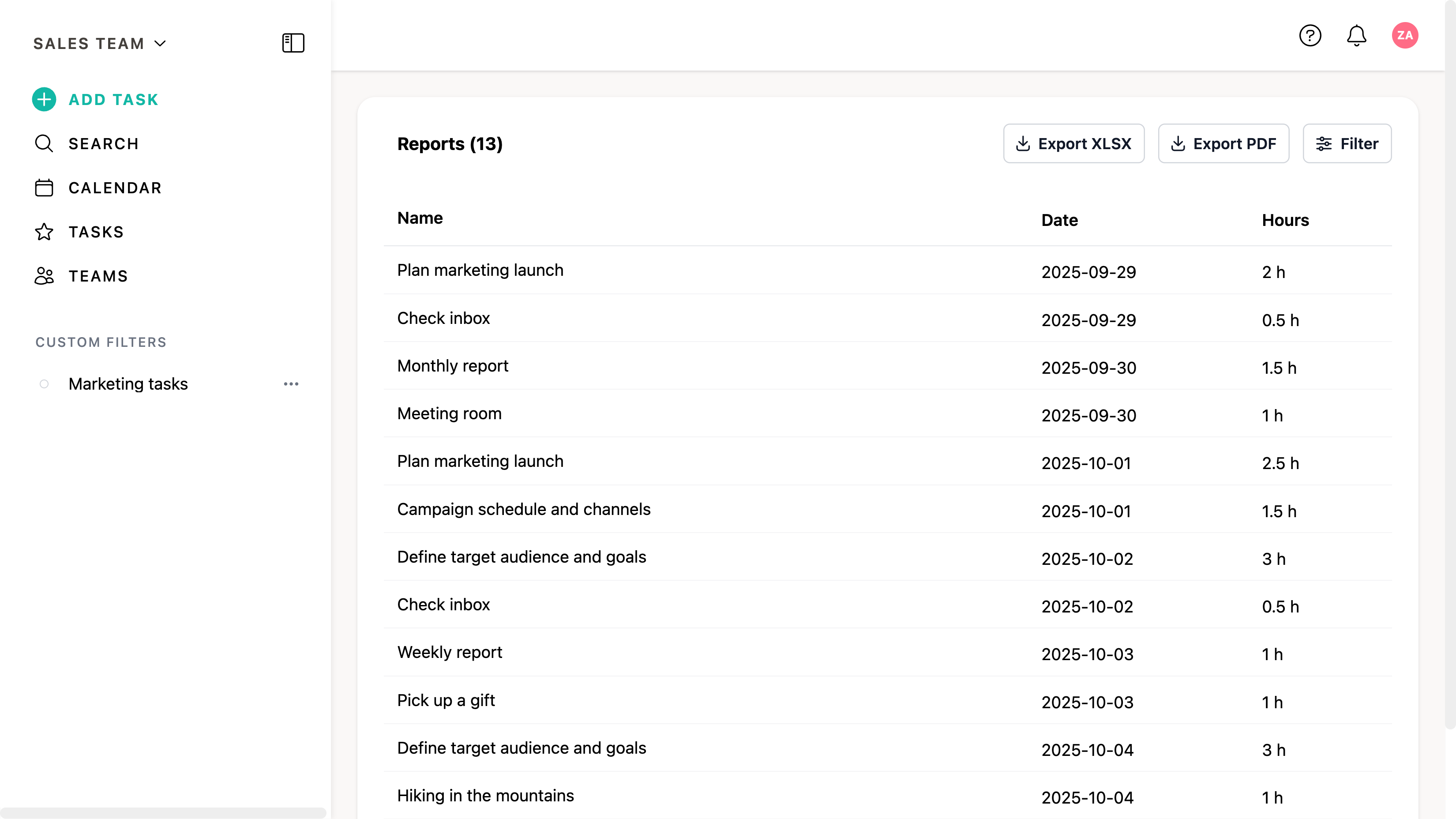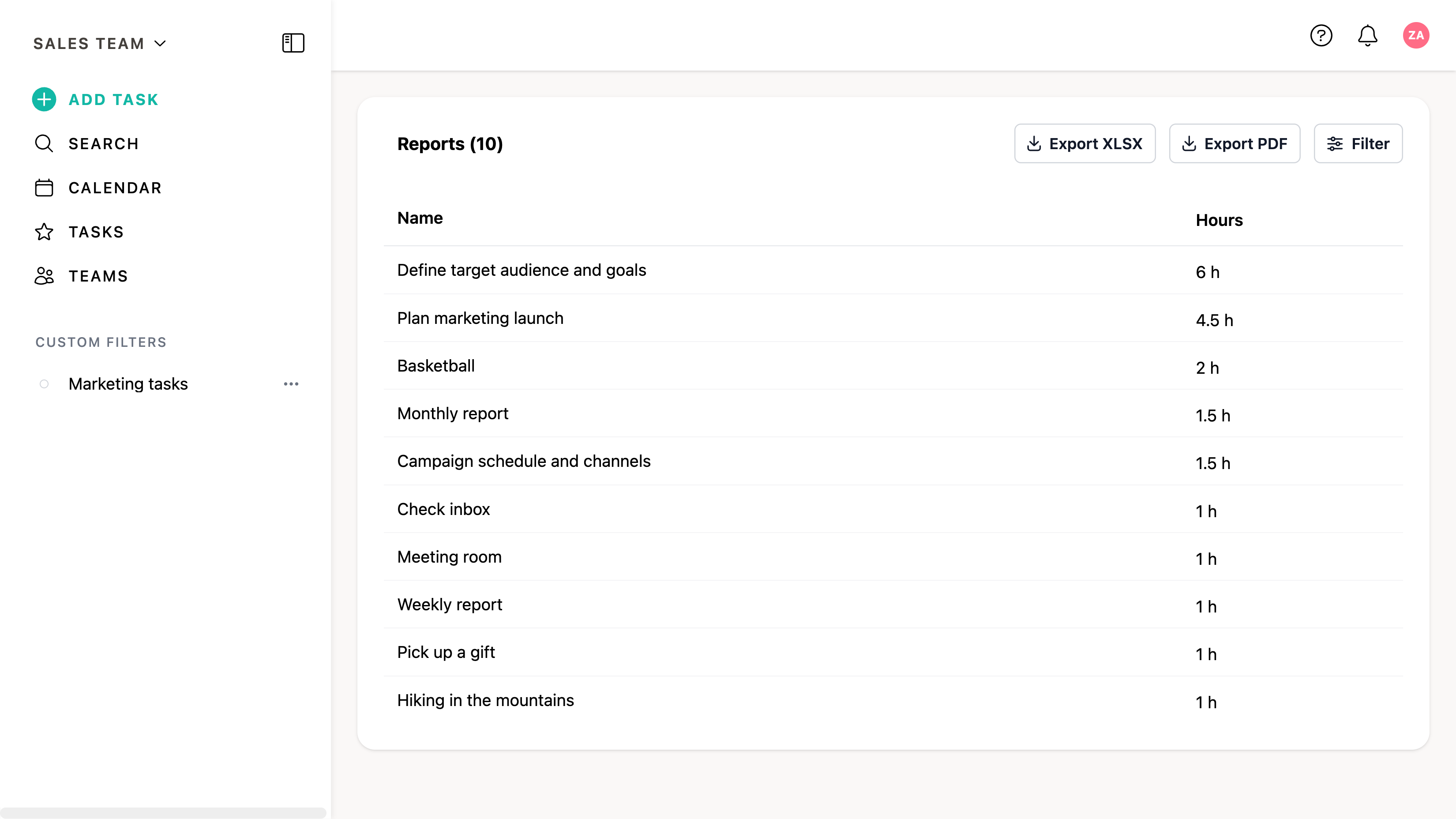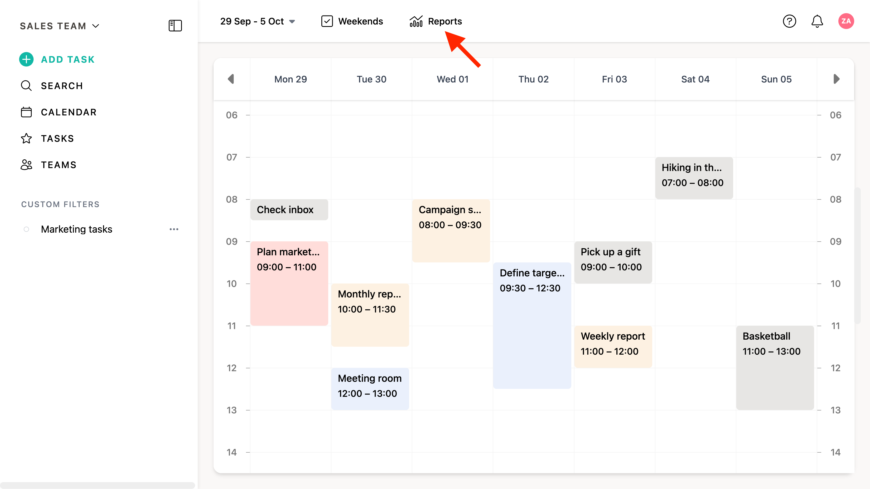 To generate calendar reports, click the Reports button at the top of the calendar.