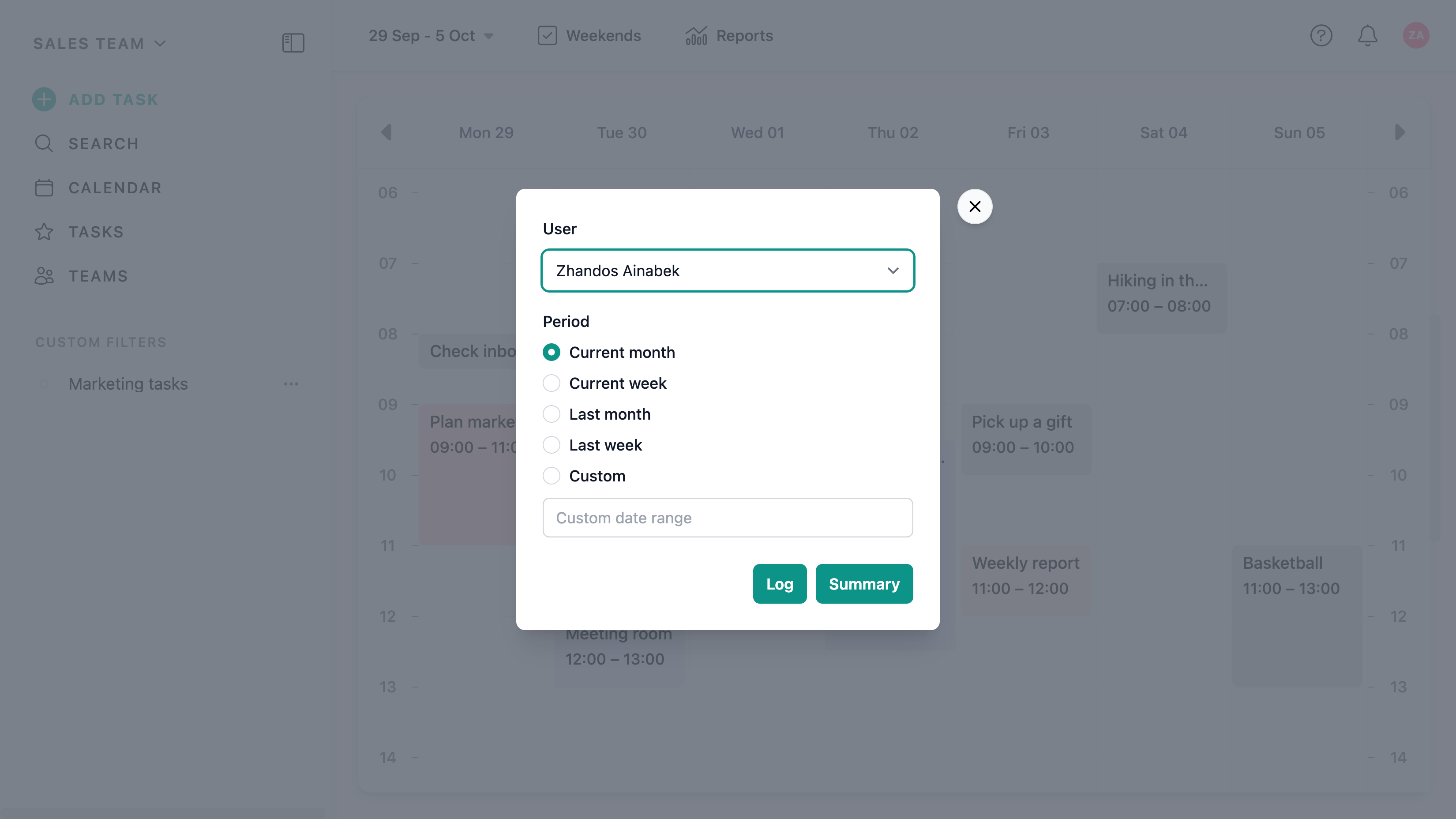 Click Log to generate a daily report showing activities with the time spent on each day.