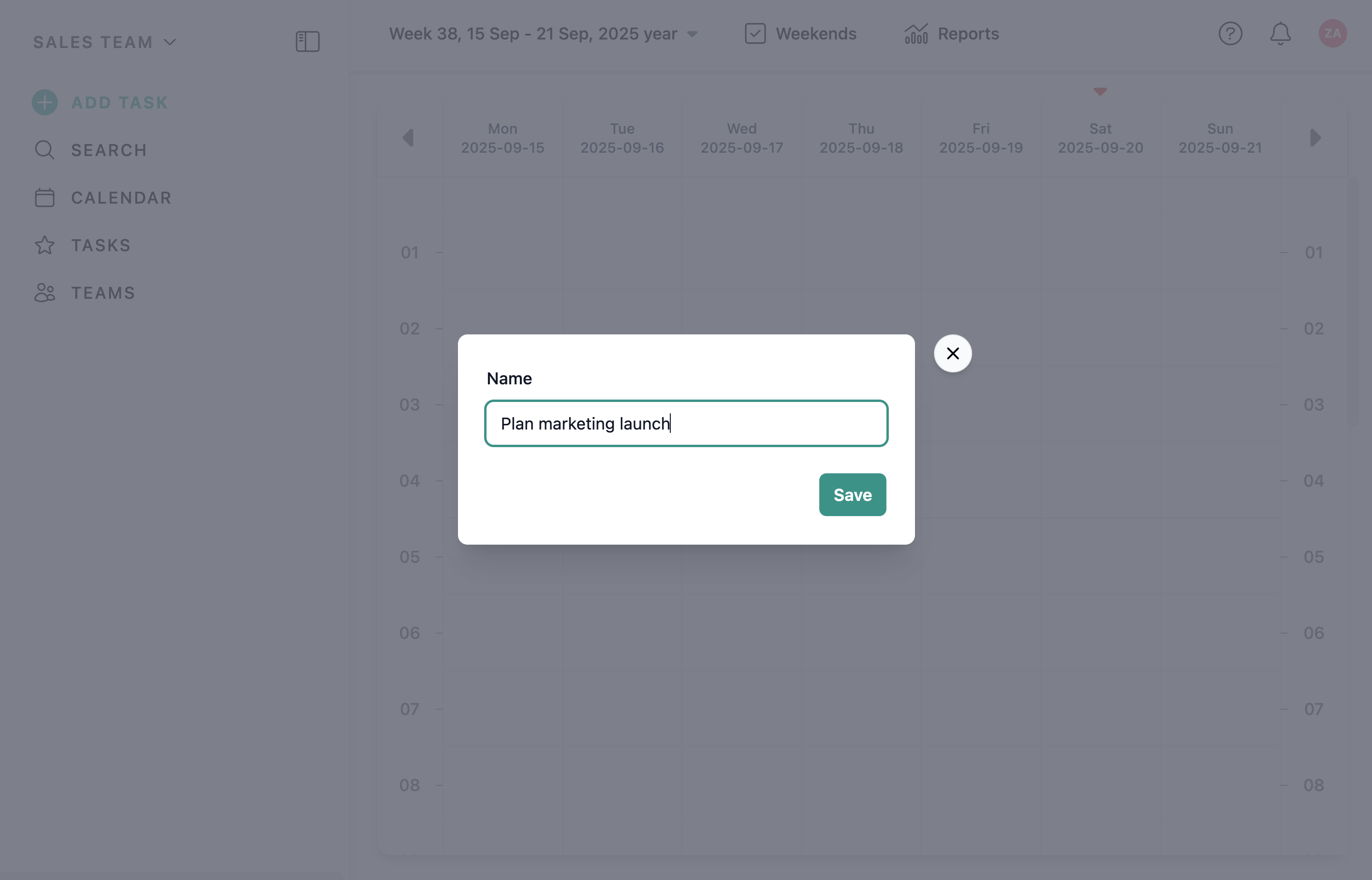 In the modal that opens, type the task name and press Enter, or click the Save button. If you change your mind, press Esc or click outside the modal to cancel.