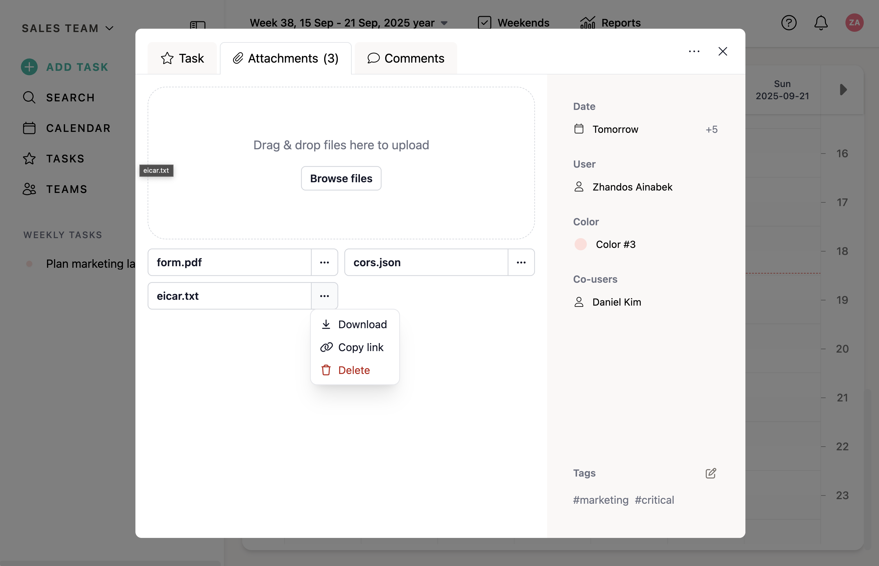 Use the ellipsis menu on each attachment to download, delete, or copy a shareable link.