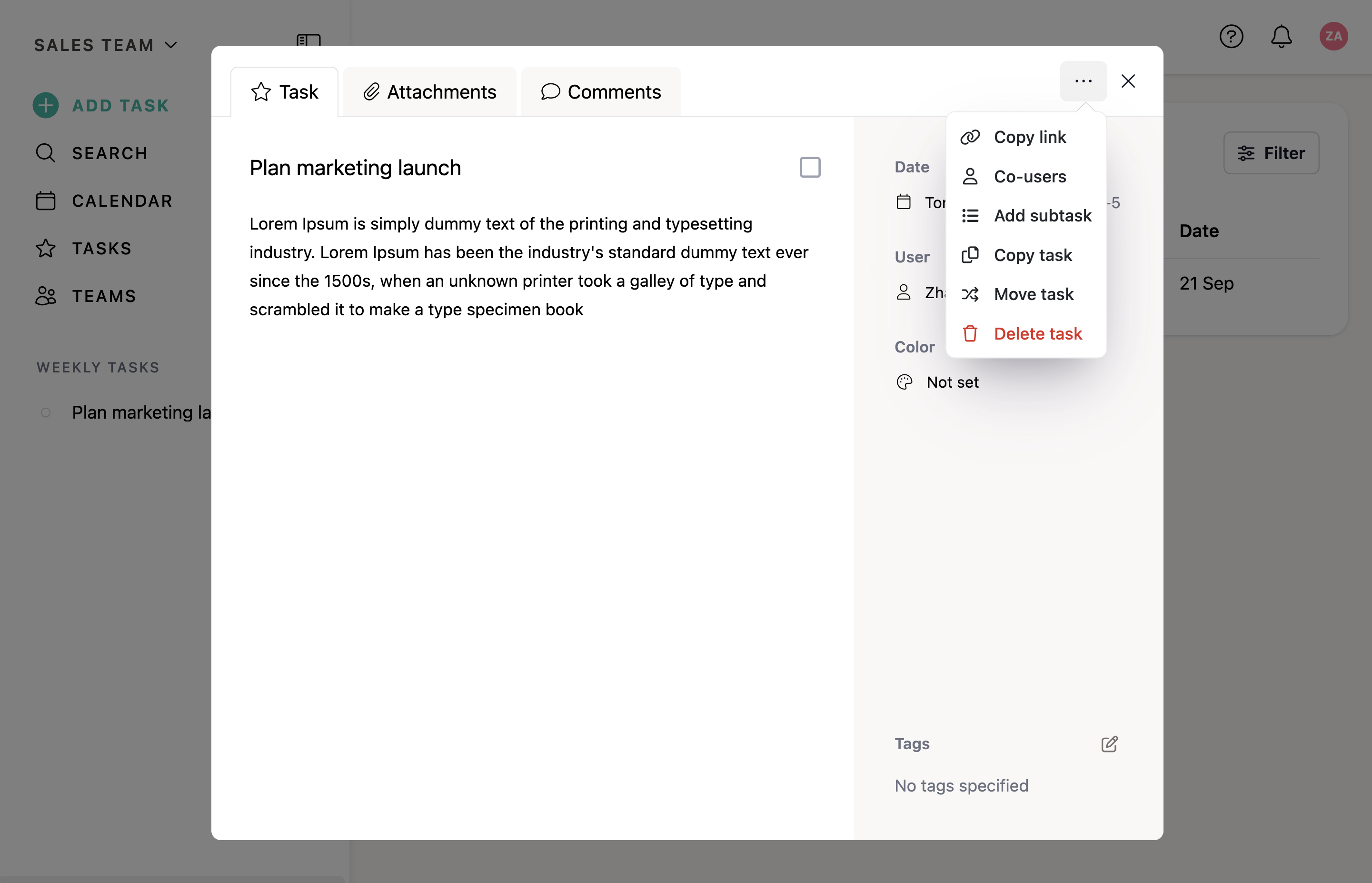 To add co-users to a task, click the ellipsis menu in the top-right corner of the task edit modal and choose Co-users.