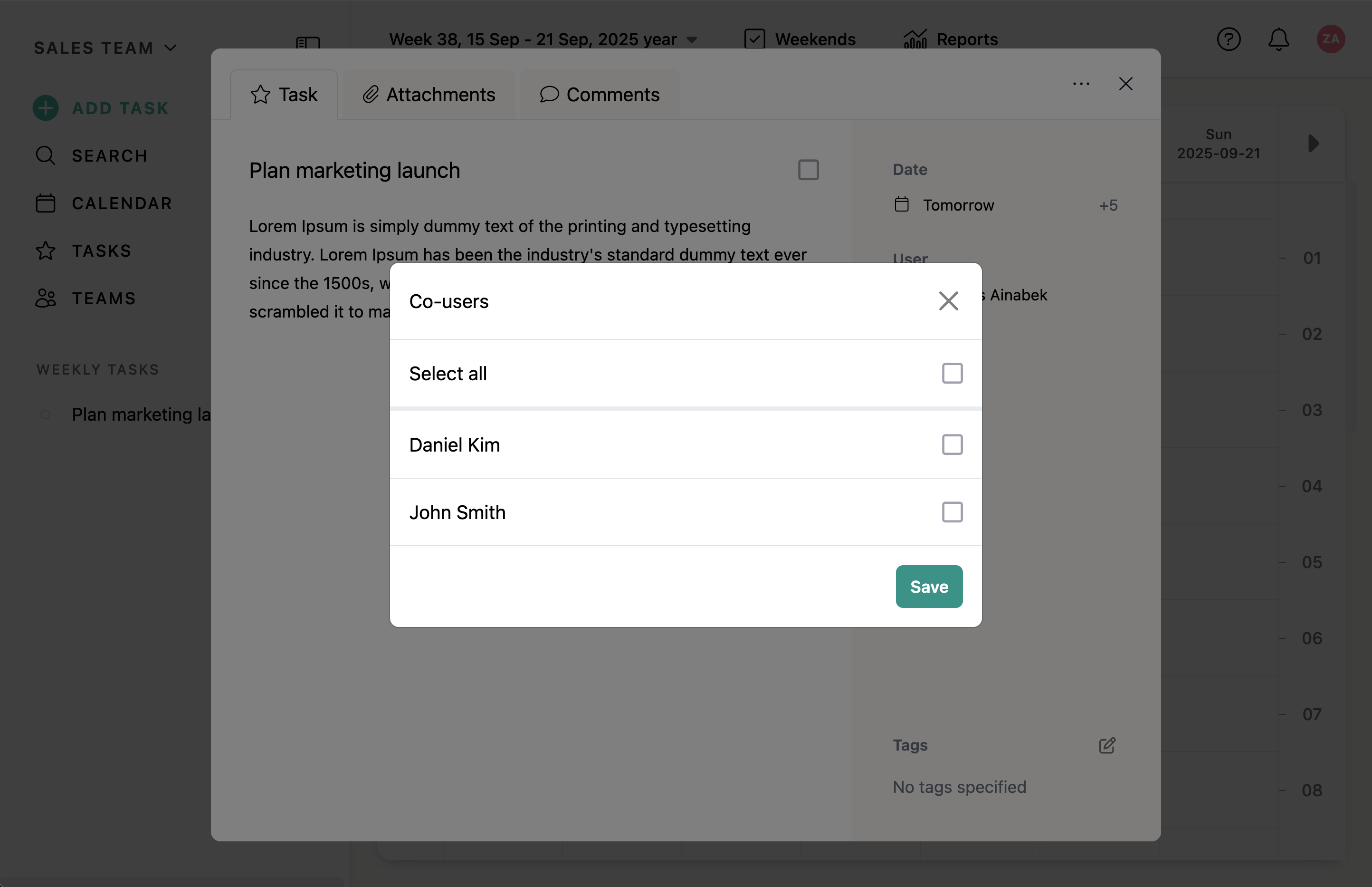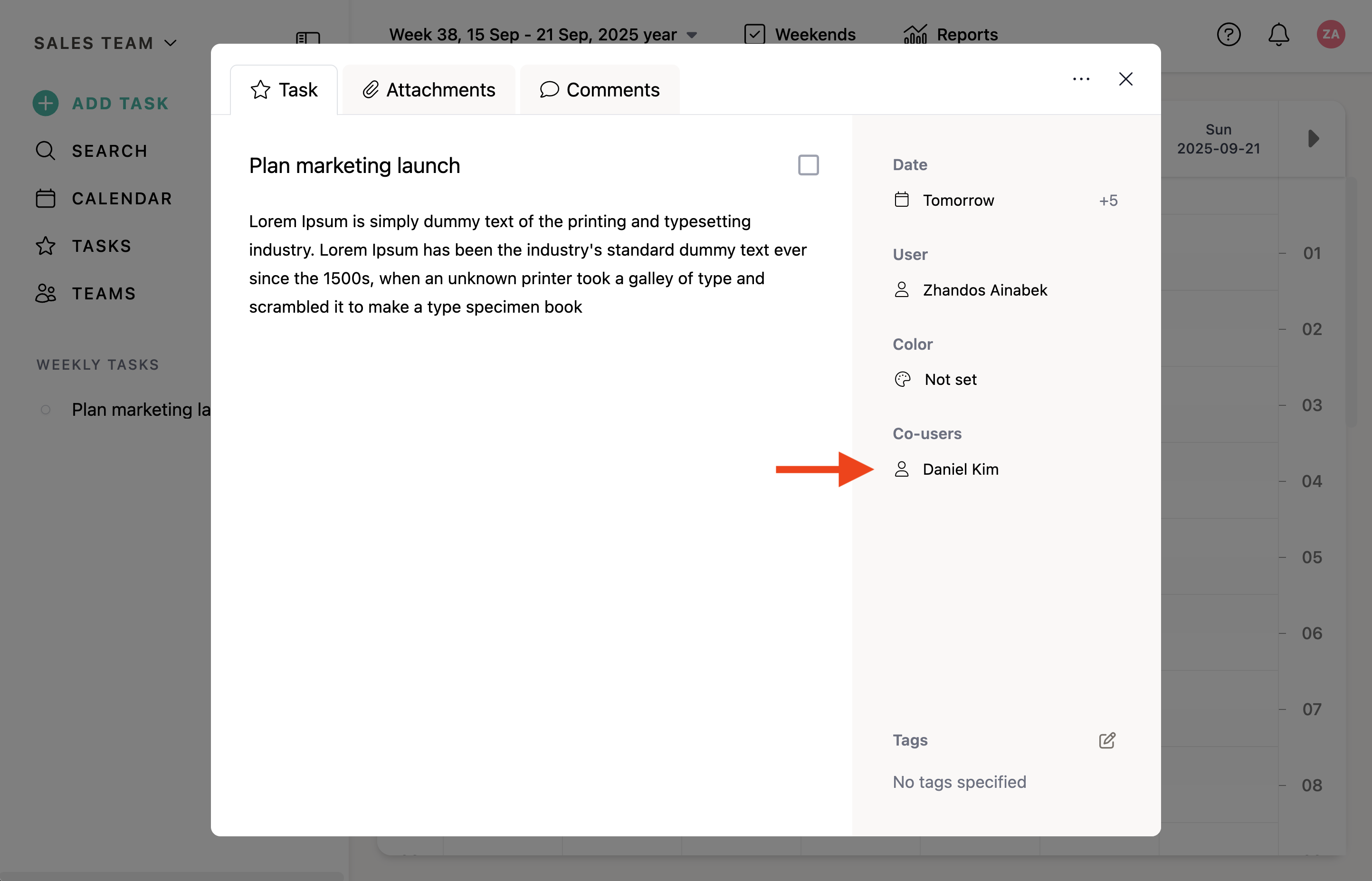 If a task has co-users, they will appear in the right panel of the task edit modal. You can also update the co-users at any time by clicking the Co-users field.