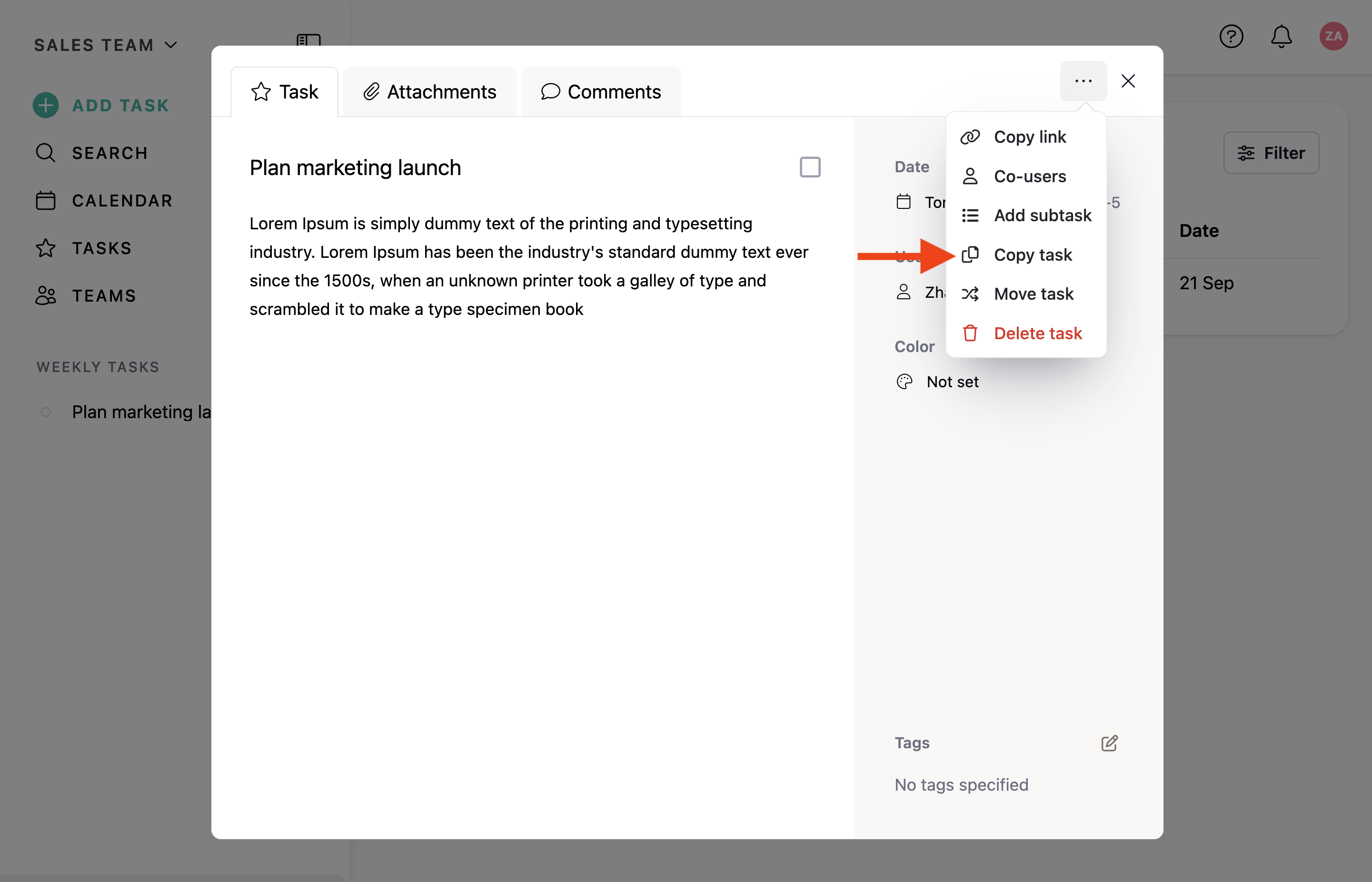 You can create a duplicate of a task. To do this, open the ellipsis menu in the top-right corner of the task edit modal and select Copy task.