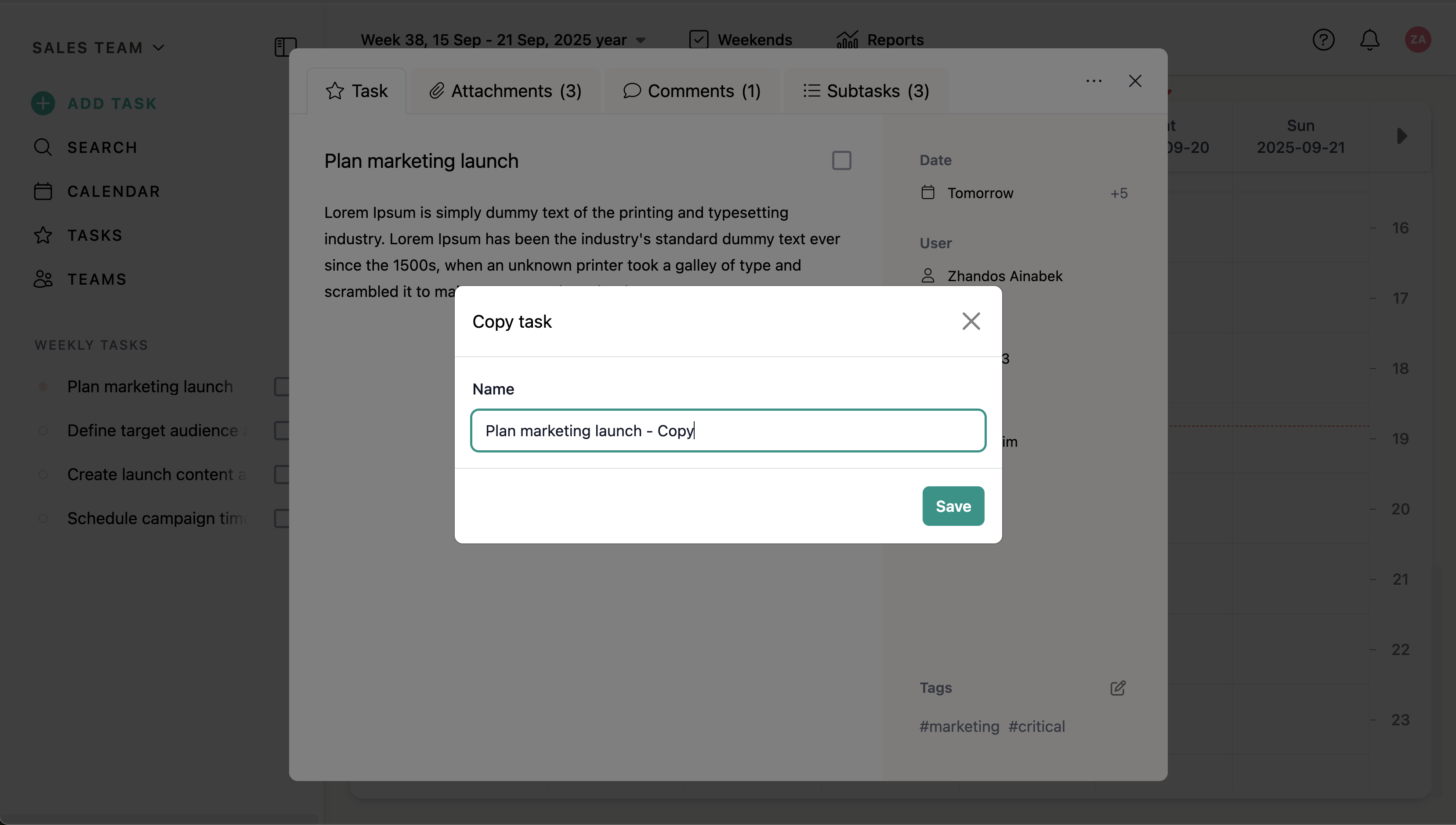In the modal that opens, you can rename the duplicated task. Press Enter or click Save to create the copy.