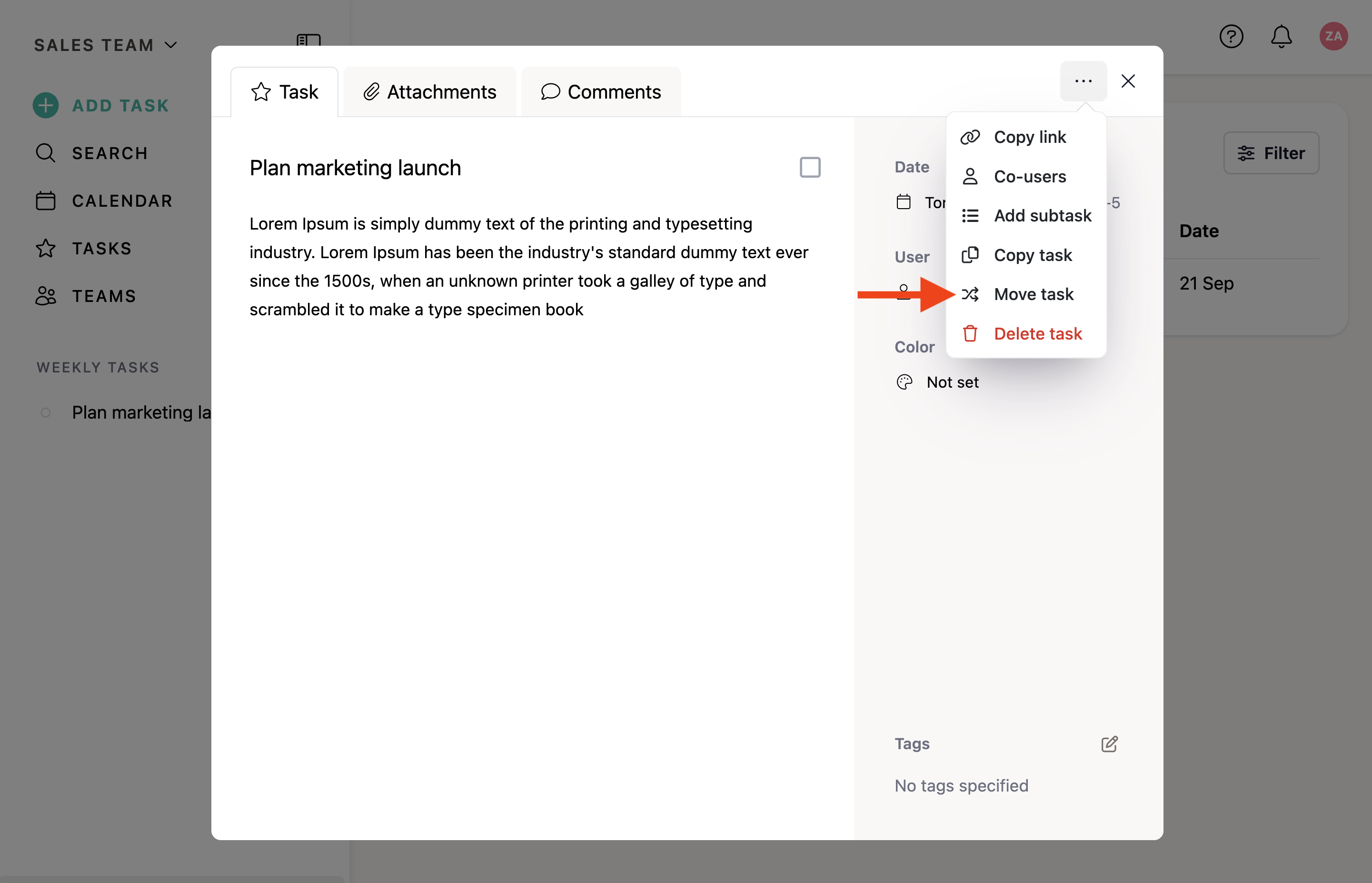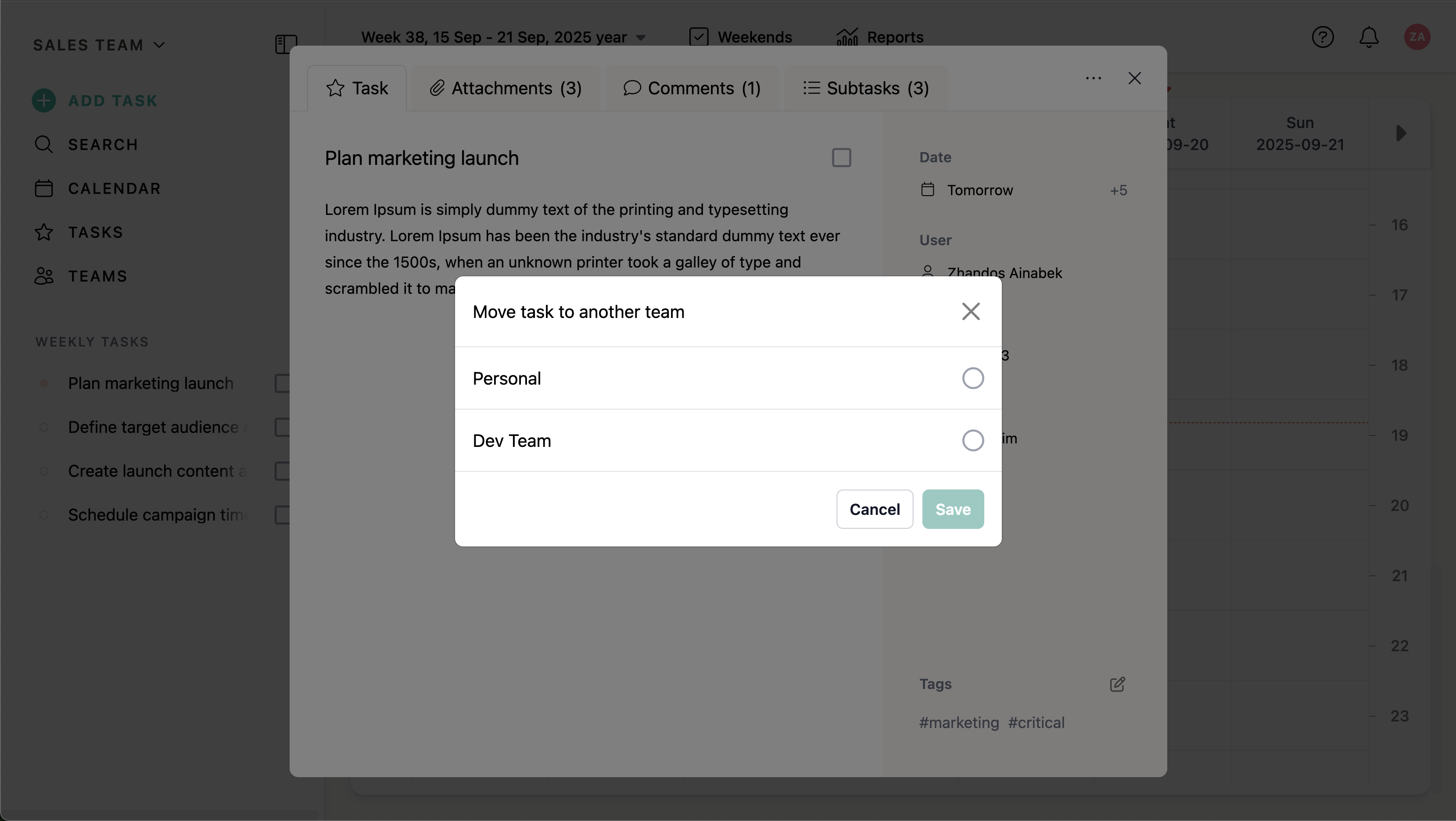 In the modal that opens, choose the team you want to move the task to and click Save.