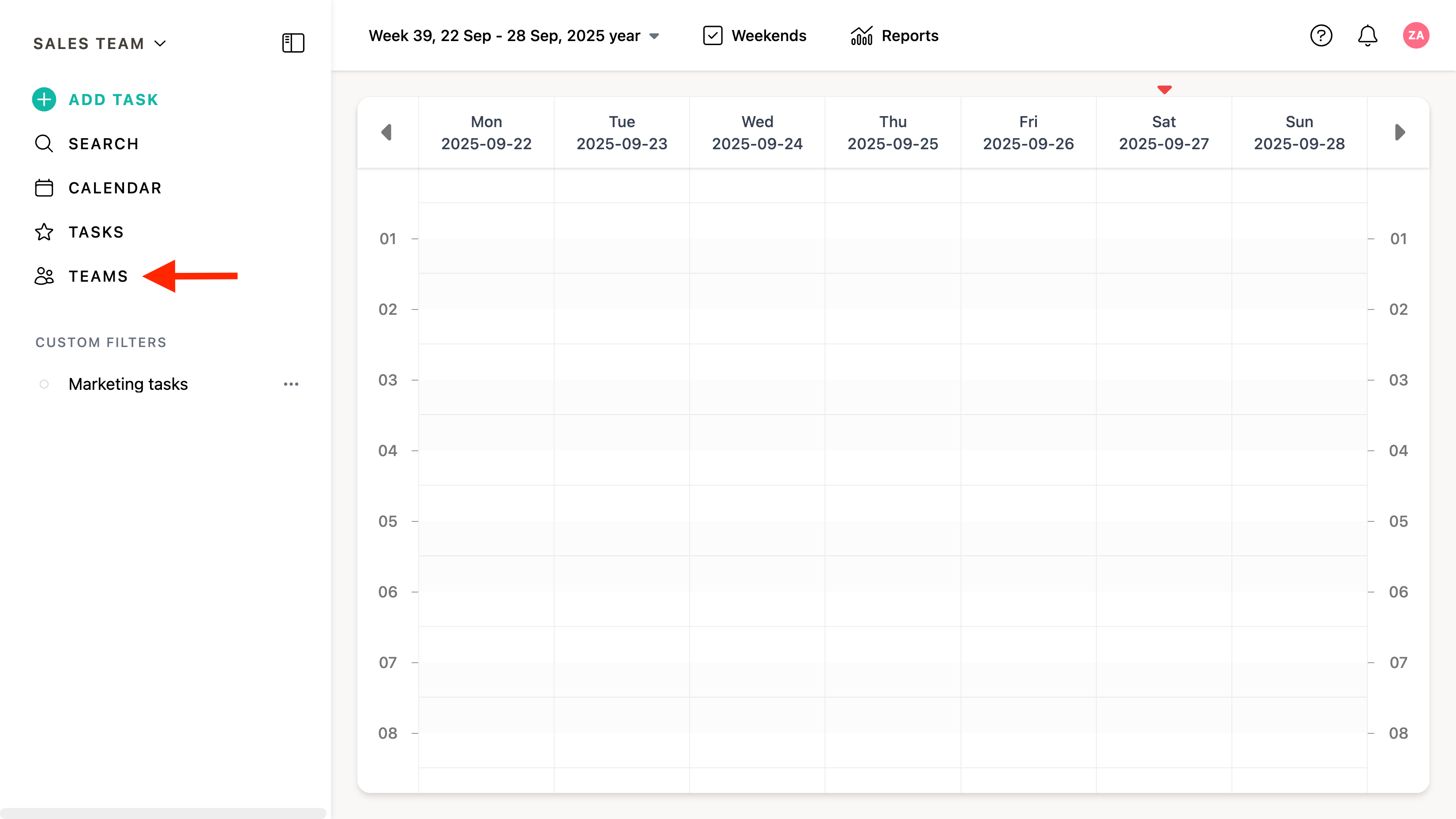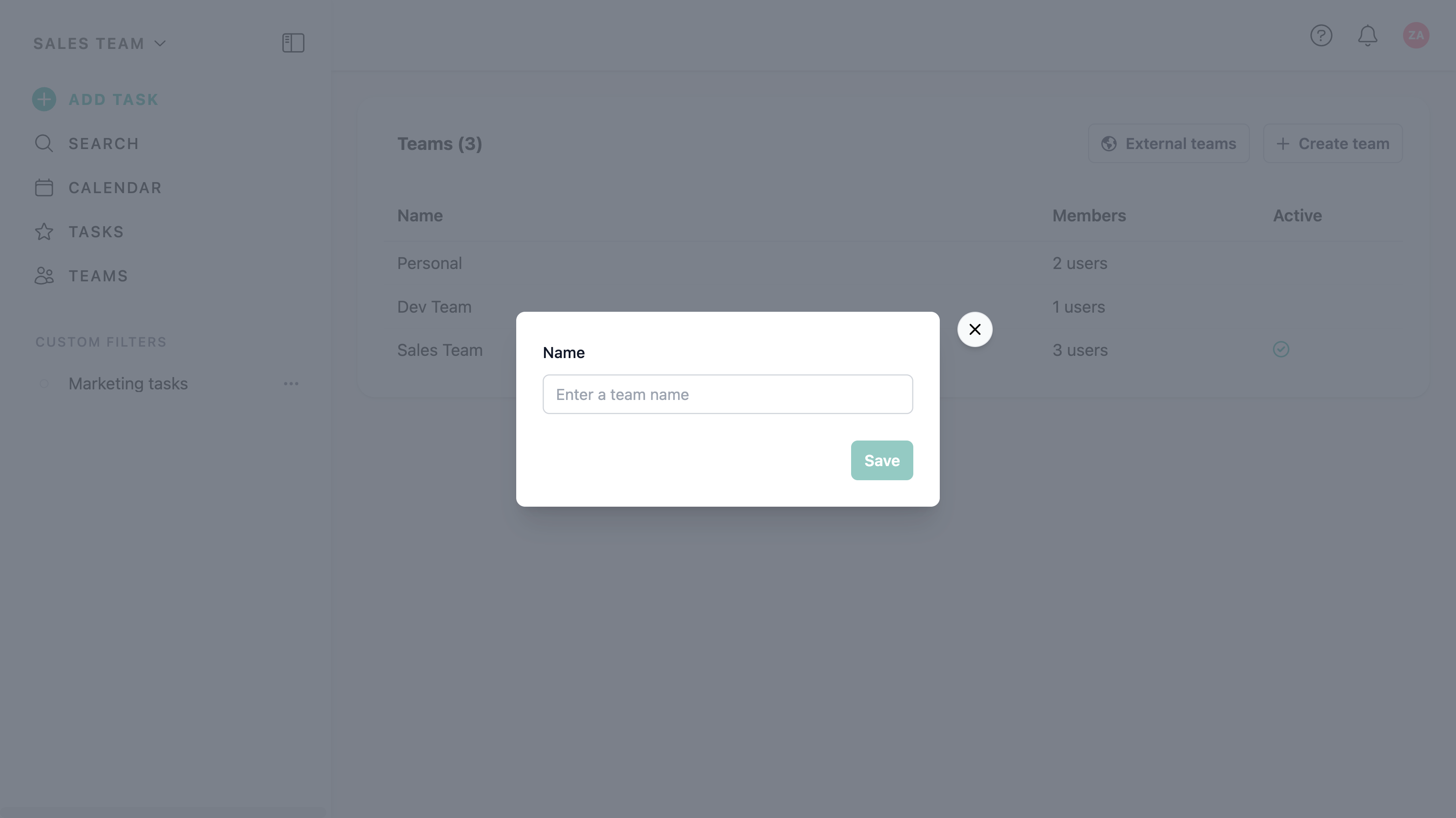 To create a new team, first go to the Teams page by clicking Teams in the sidebar.