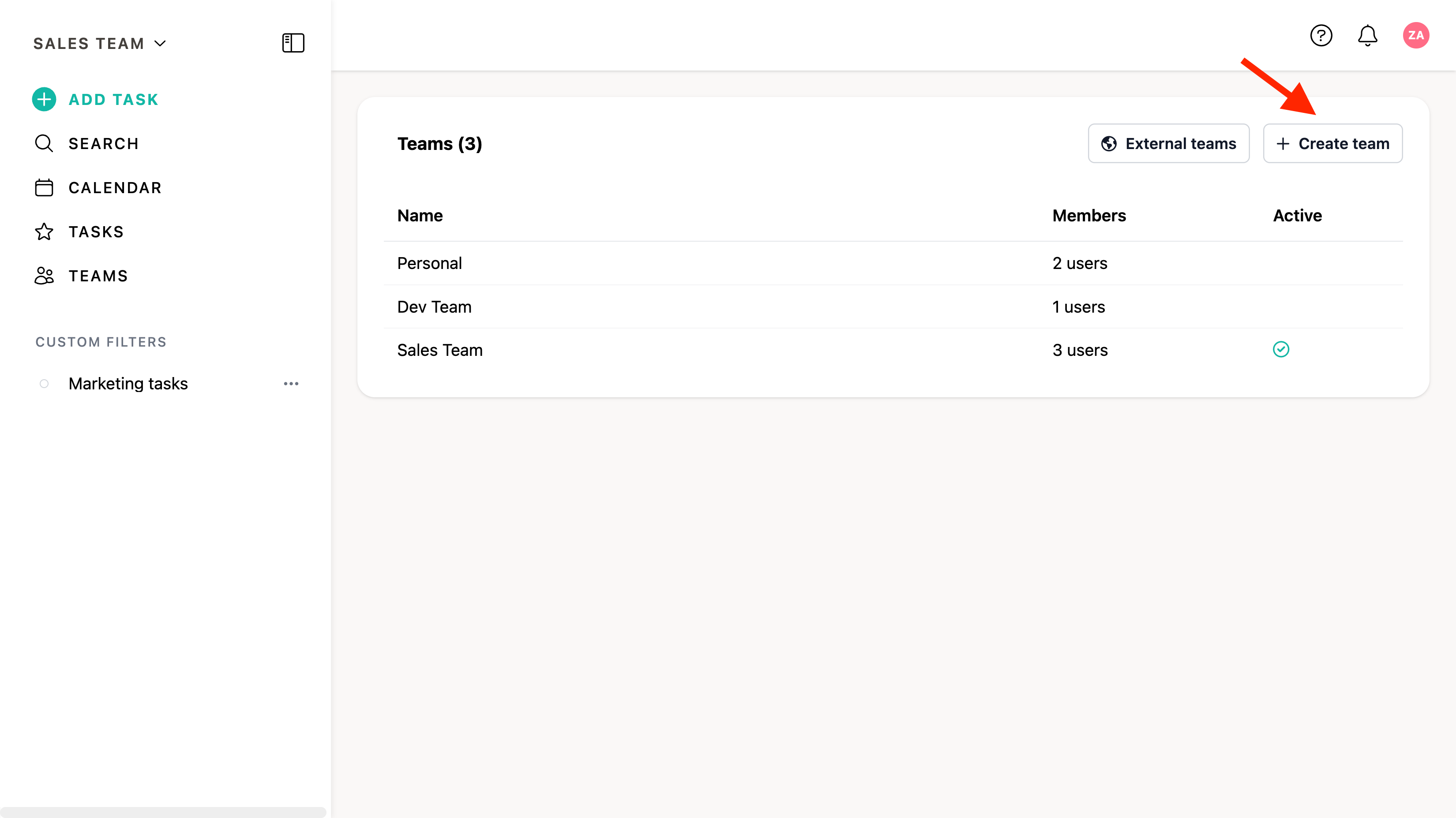 On the Teams page, click the Create team button in the top-right corner of the list.