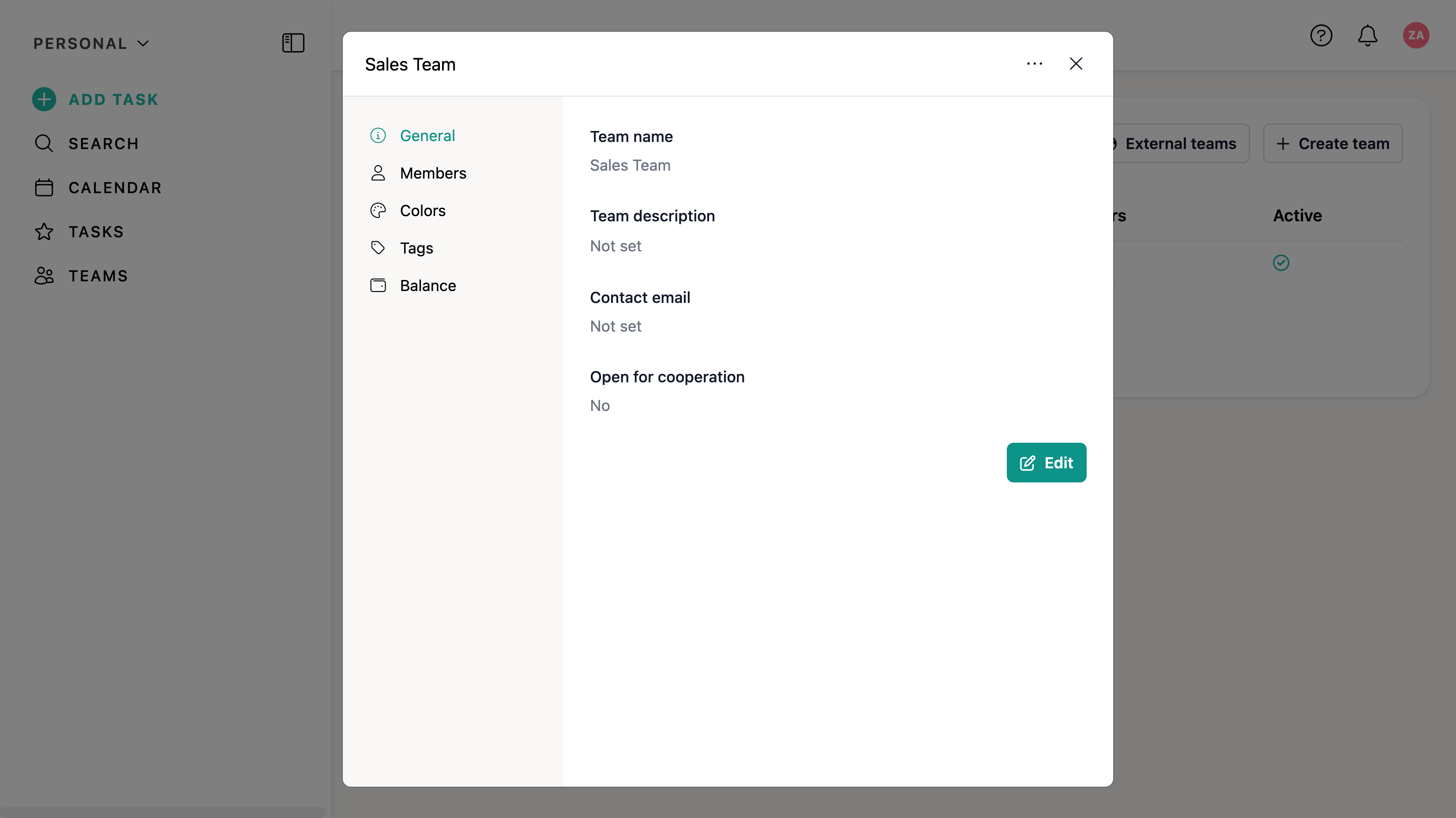 Once saved, the team edit modal will open, where you can continue setting up and customizing your team.