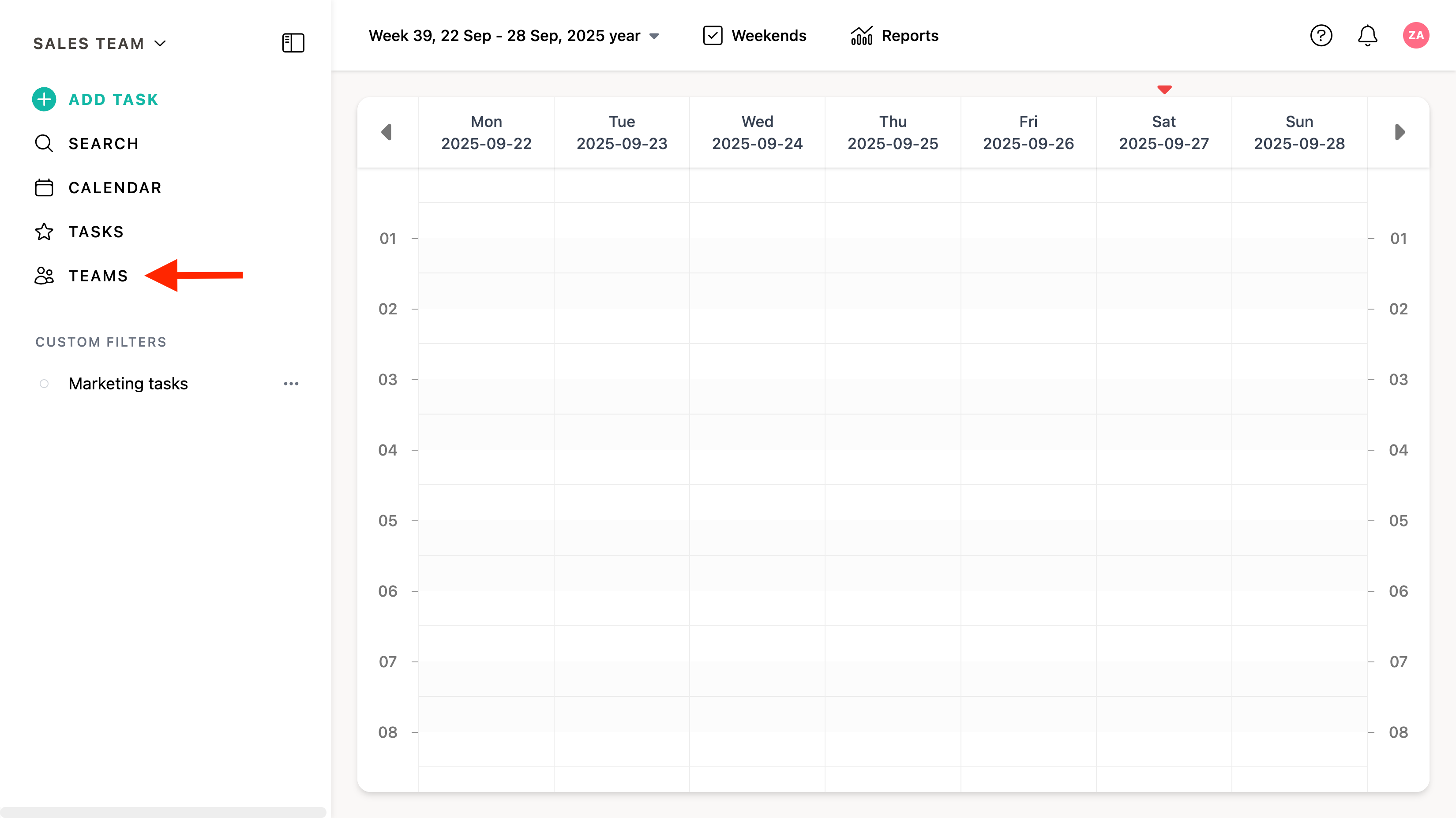 To edit a team, first go to the Teams page by clicking Teams in the sidebar.