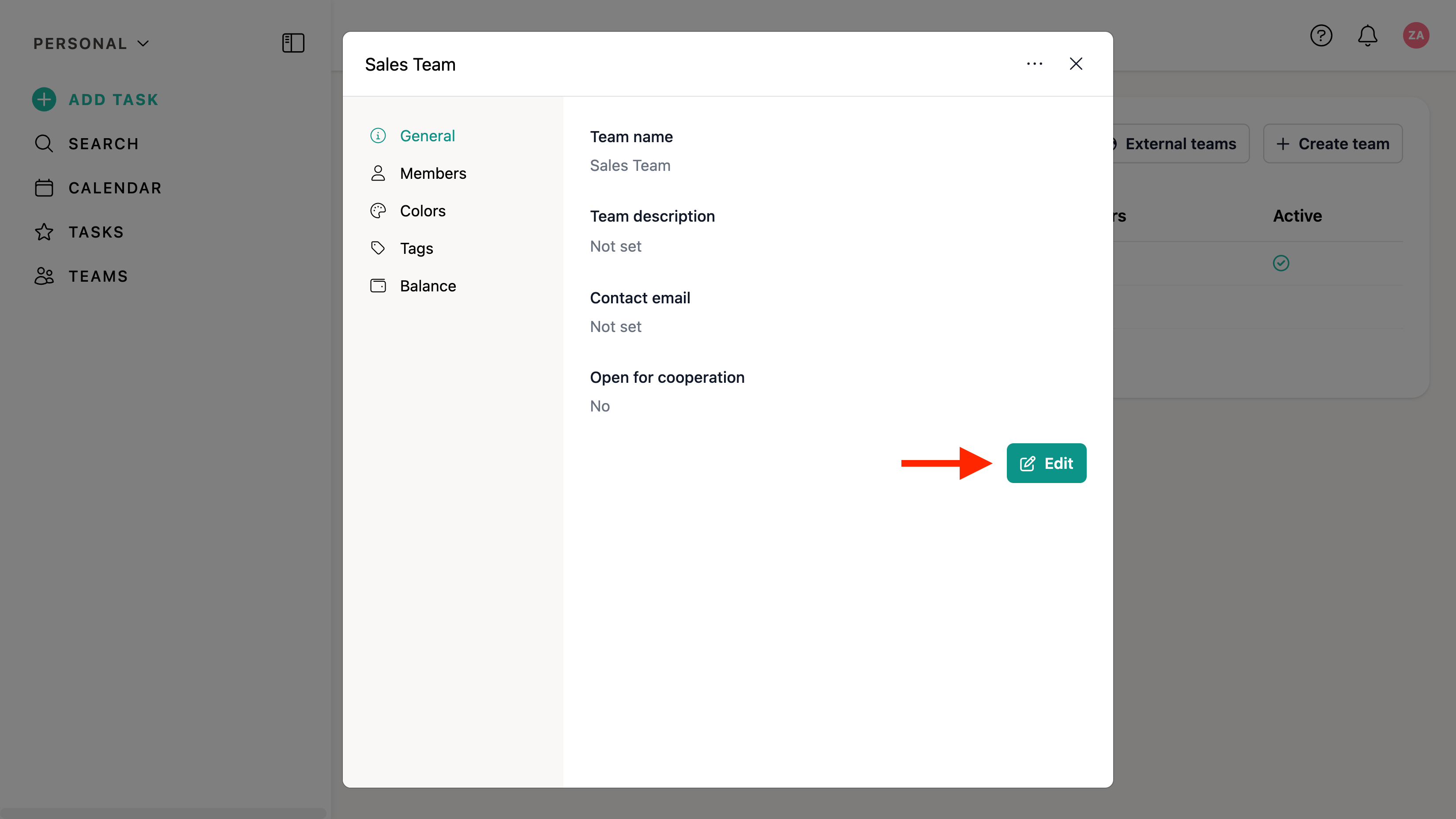 In the modal that opens, you’ll see the team details. Click the Edit button in the bottom-right corner to start editing.