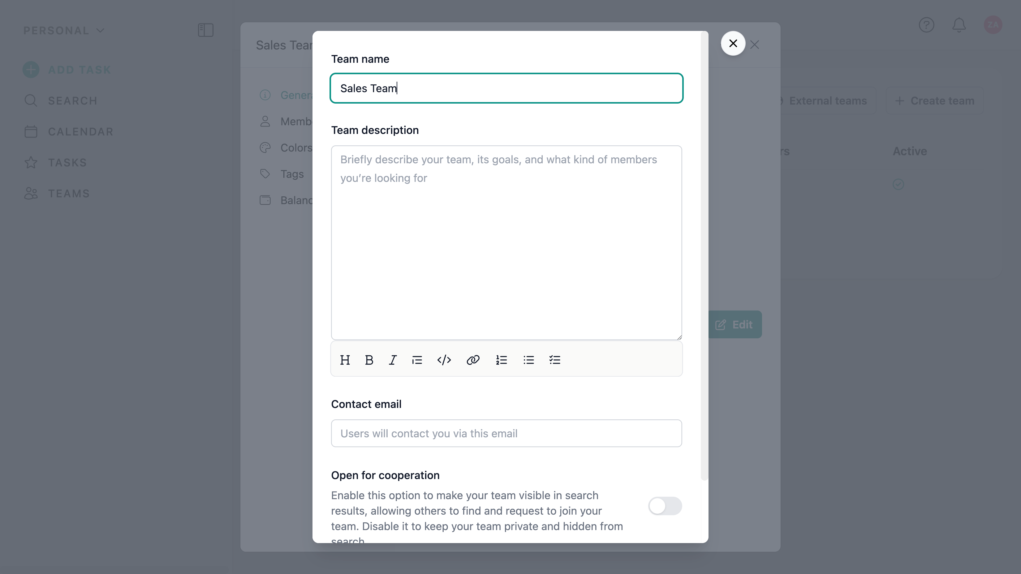 You can update the team’s name, description, and contact email. You can also toggle the Open for cooperation option to control whether the team is visible to others for collaboration.