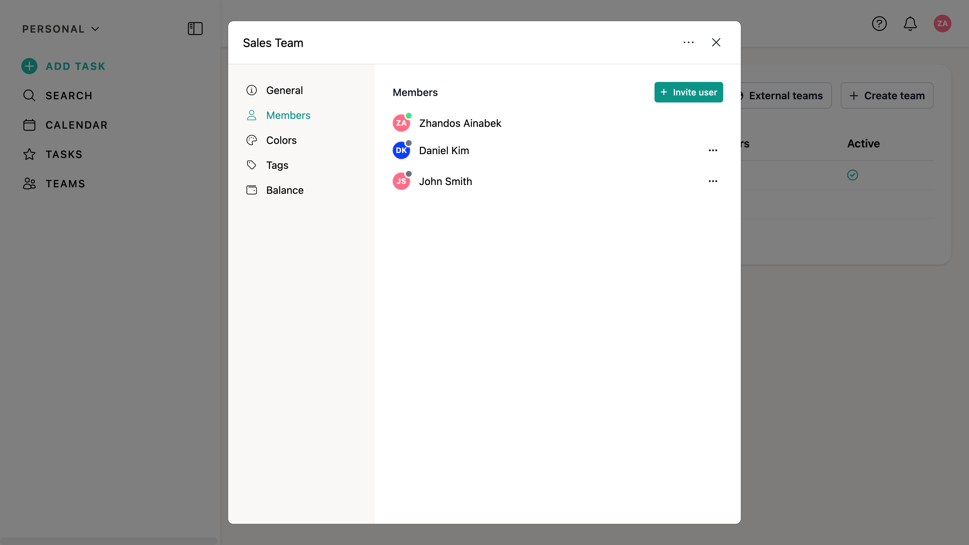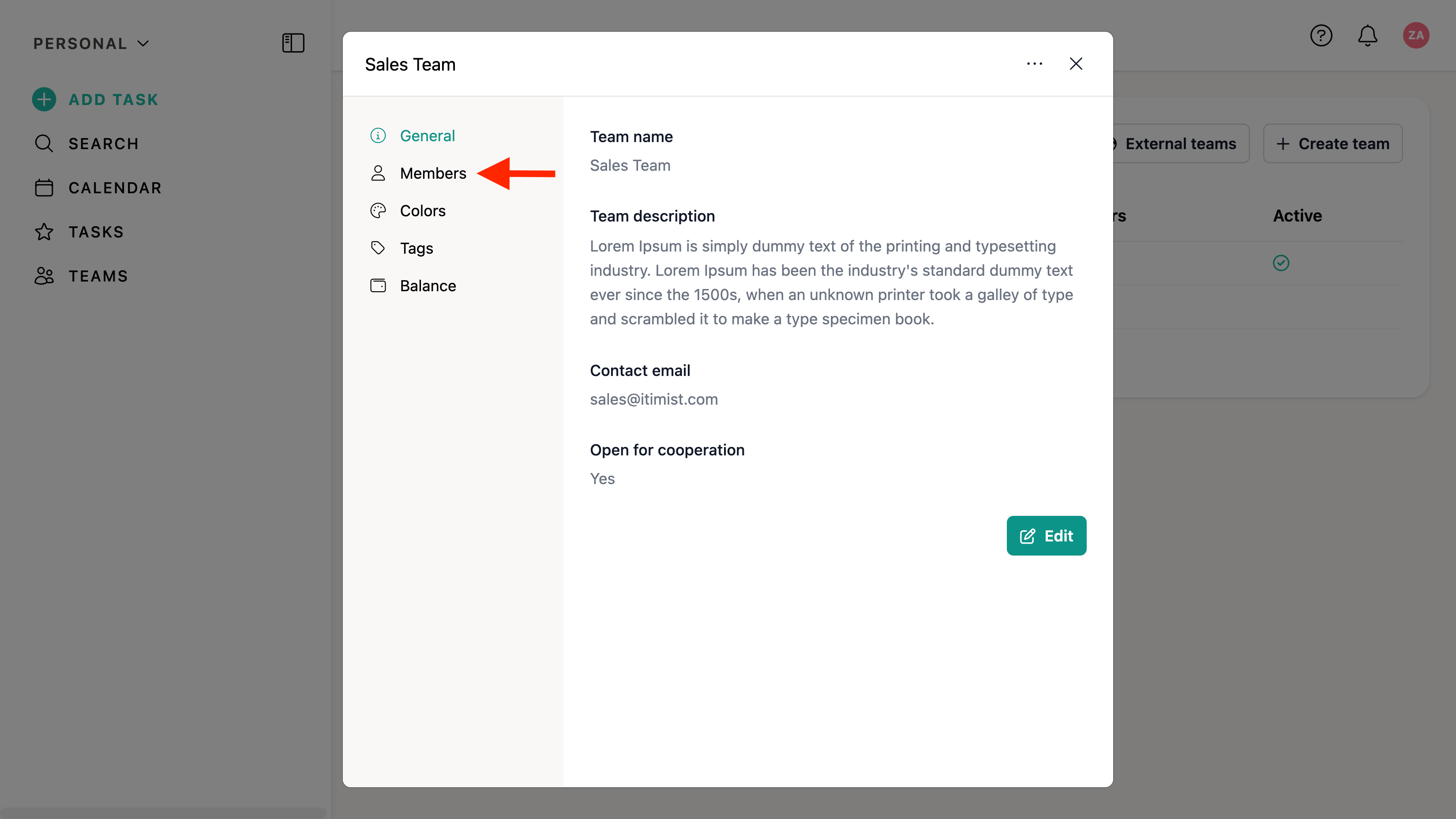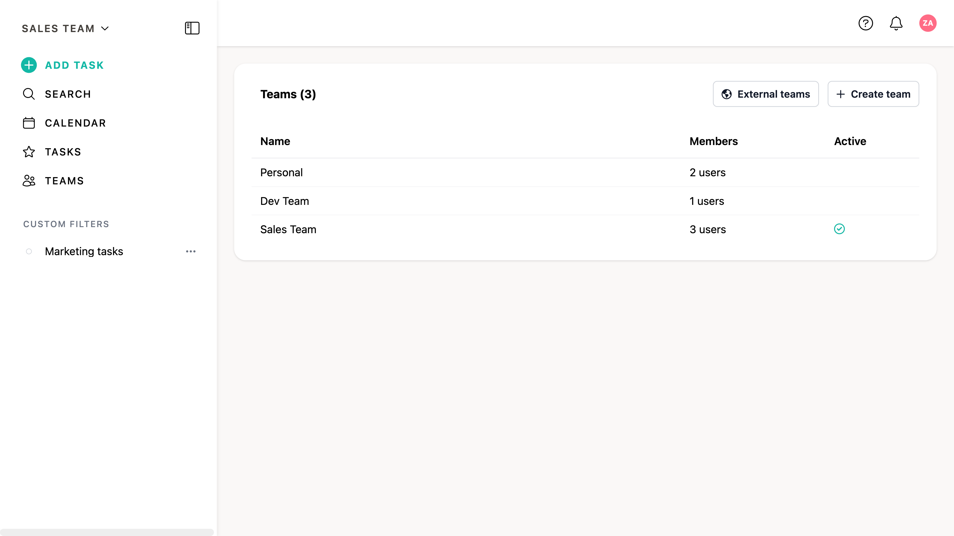 To manage team members, first go to the Teams page by clicking Teams in the sidebar.