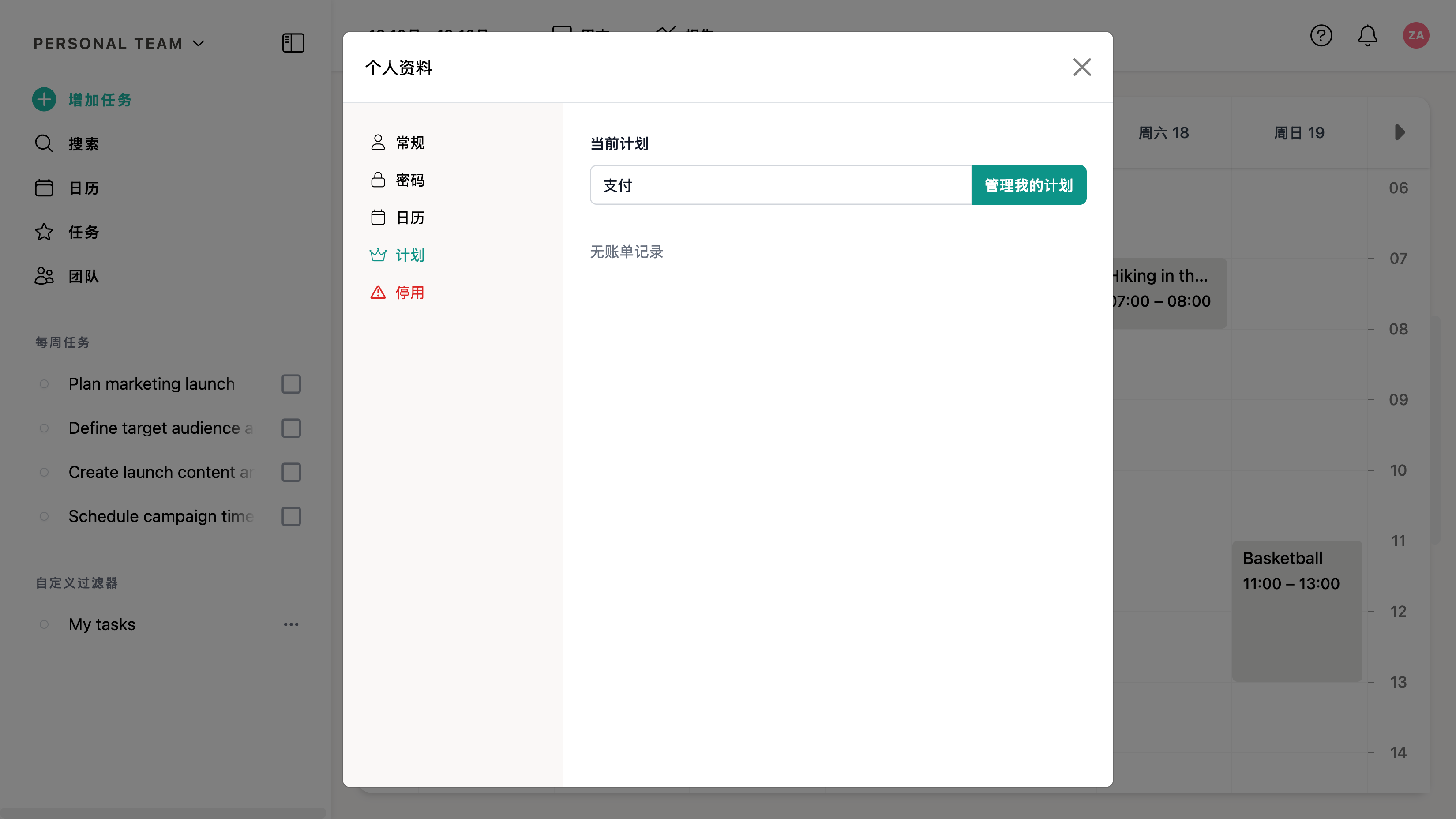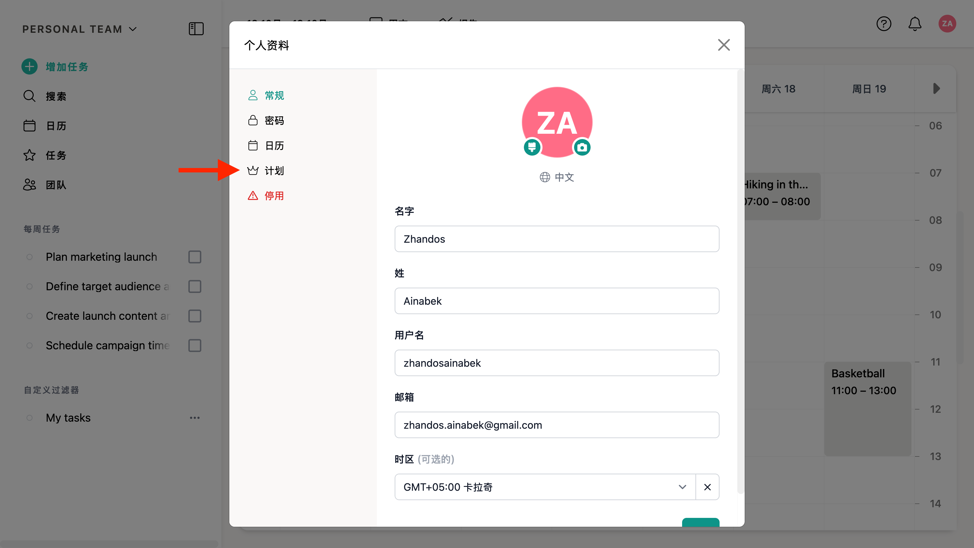 在个人资料弹窗中,点击左侧面板的 方案(Plan)。