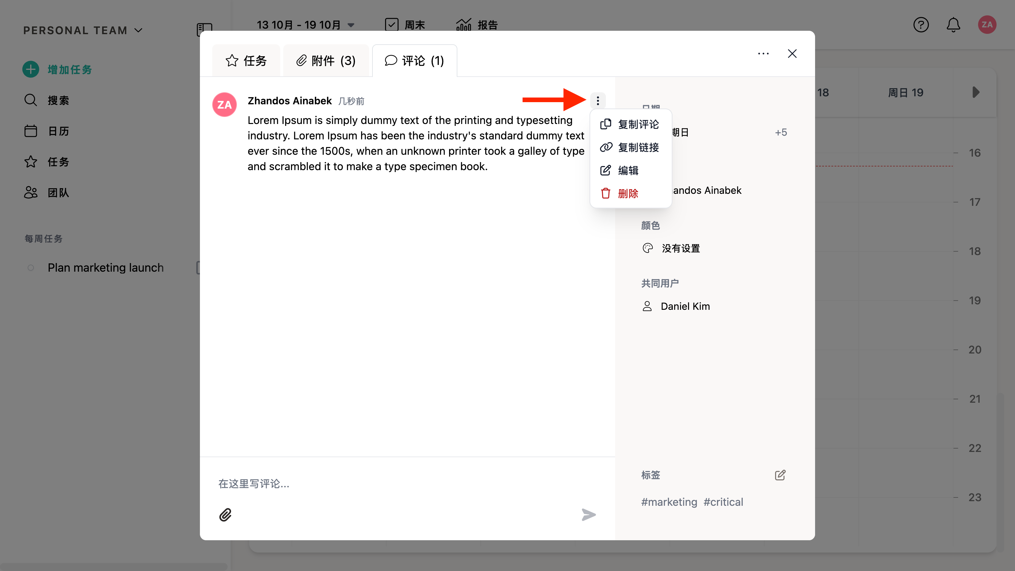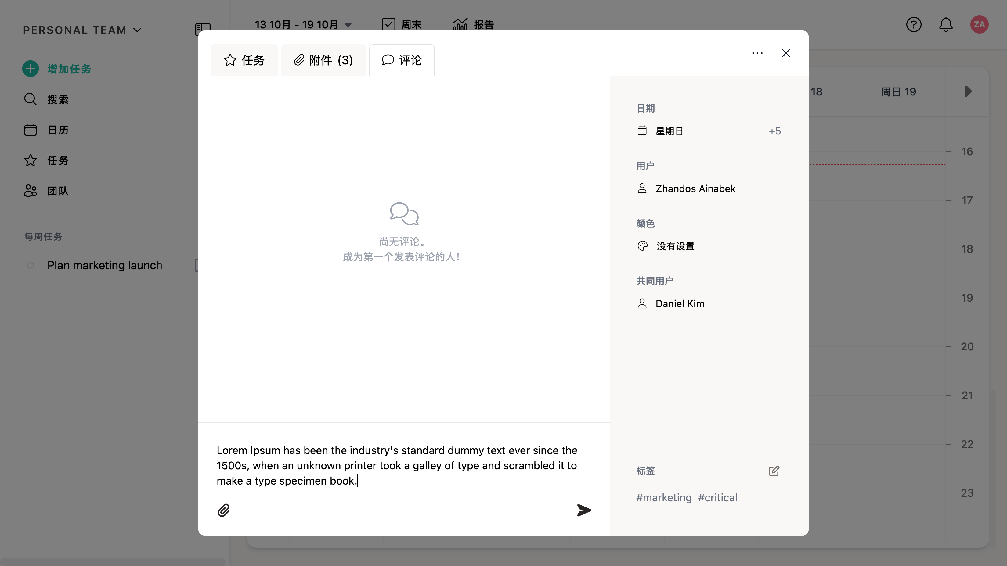 您可以在任务编辑窗口的 评论 选项卡中查看和管理任务评论。使用底部的输入框撰写新评论。按下 Enter 键或点击发送图标即可发布评论。