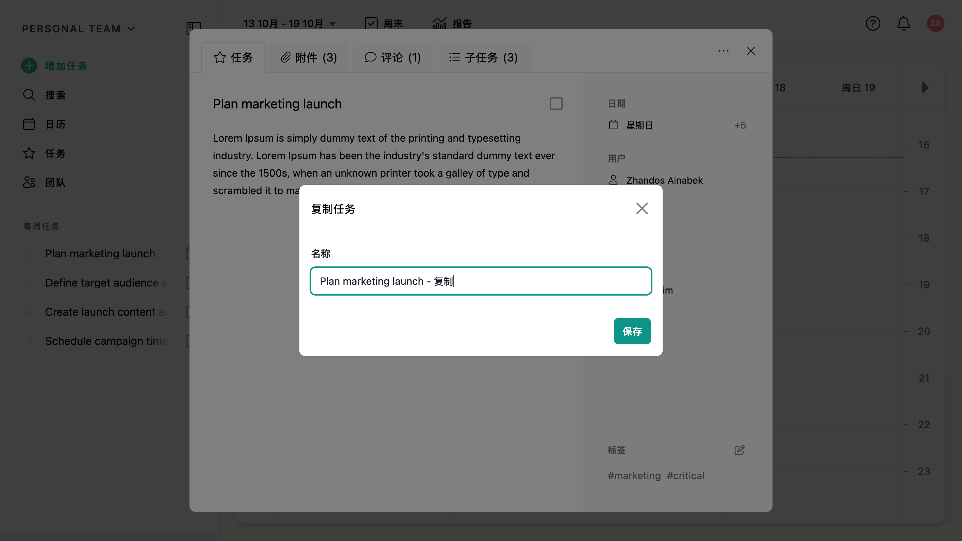 在打开的弹窗中,您可以重命名复制的任务。按下 Enter 键或点击 保存 以创建副本。