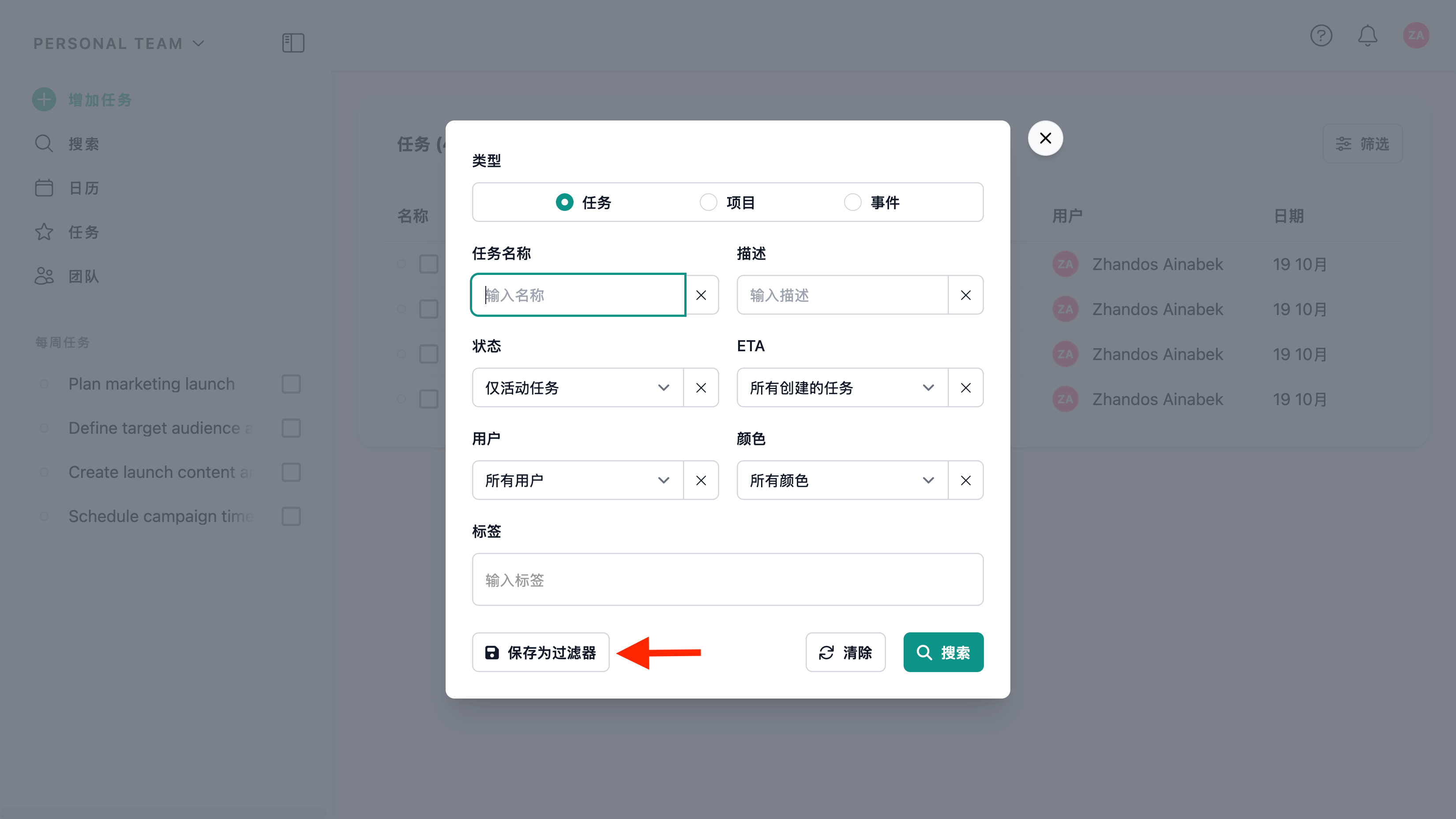 如果希望以后重复使用相同的筛选条件,请点击搜索窗口底部的 保存为筛选器。