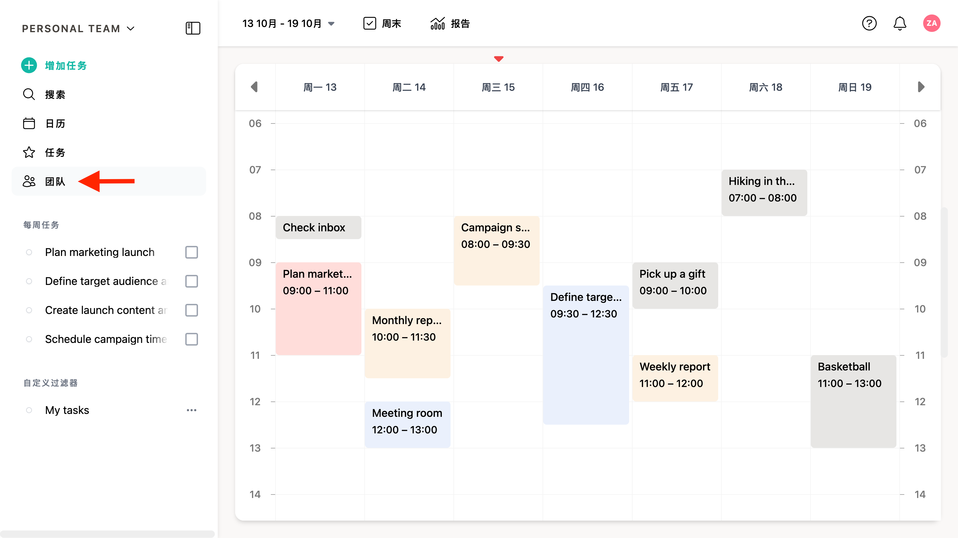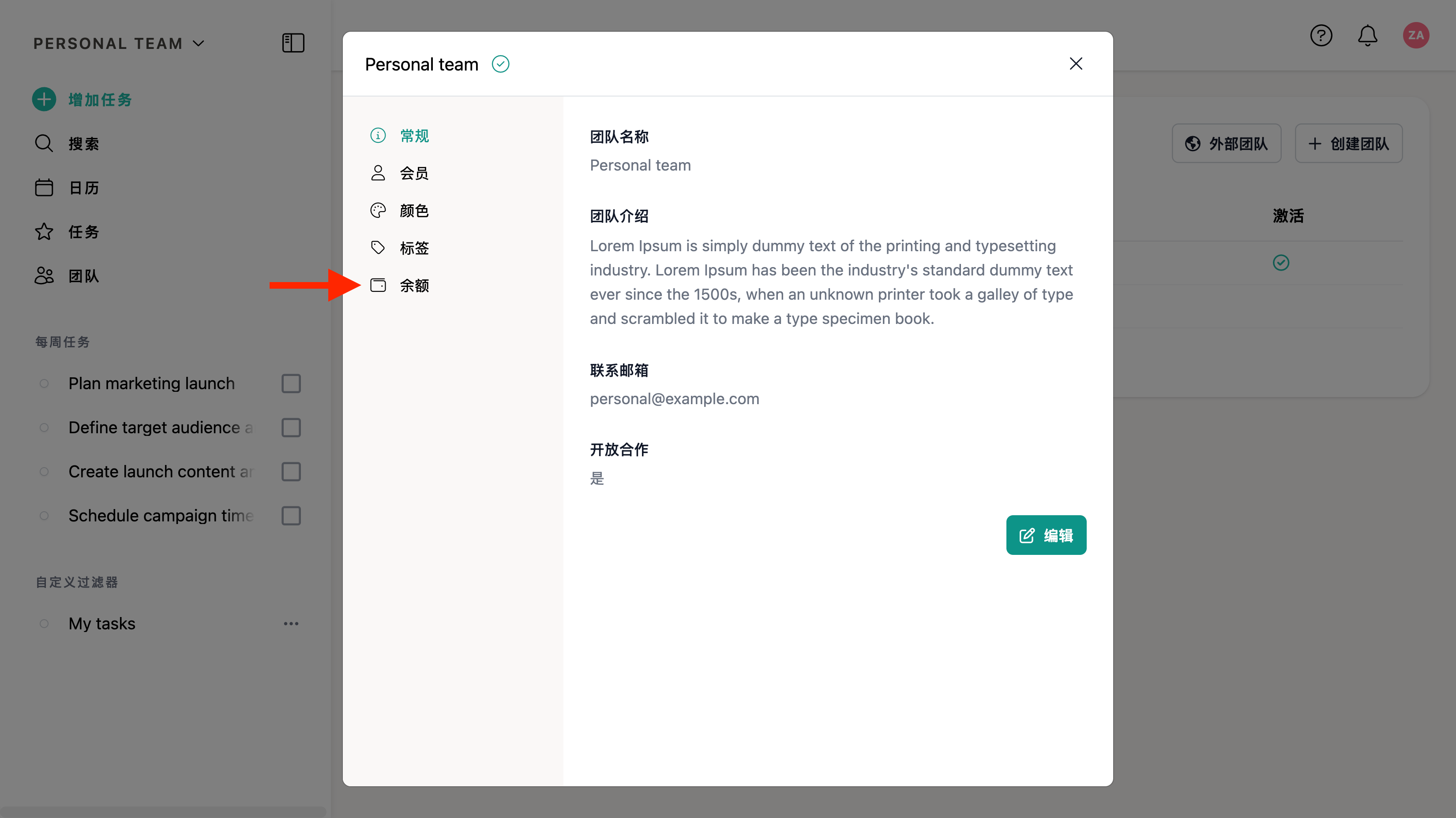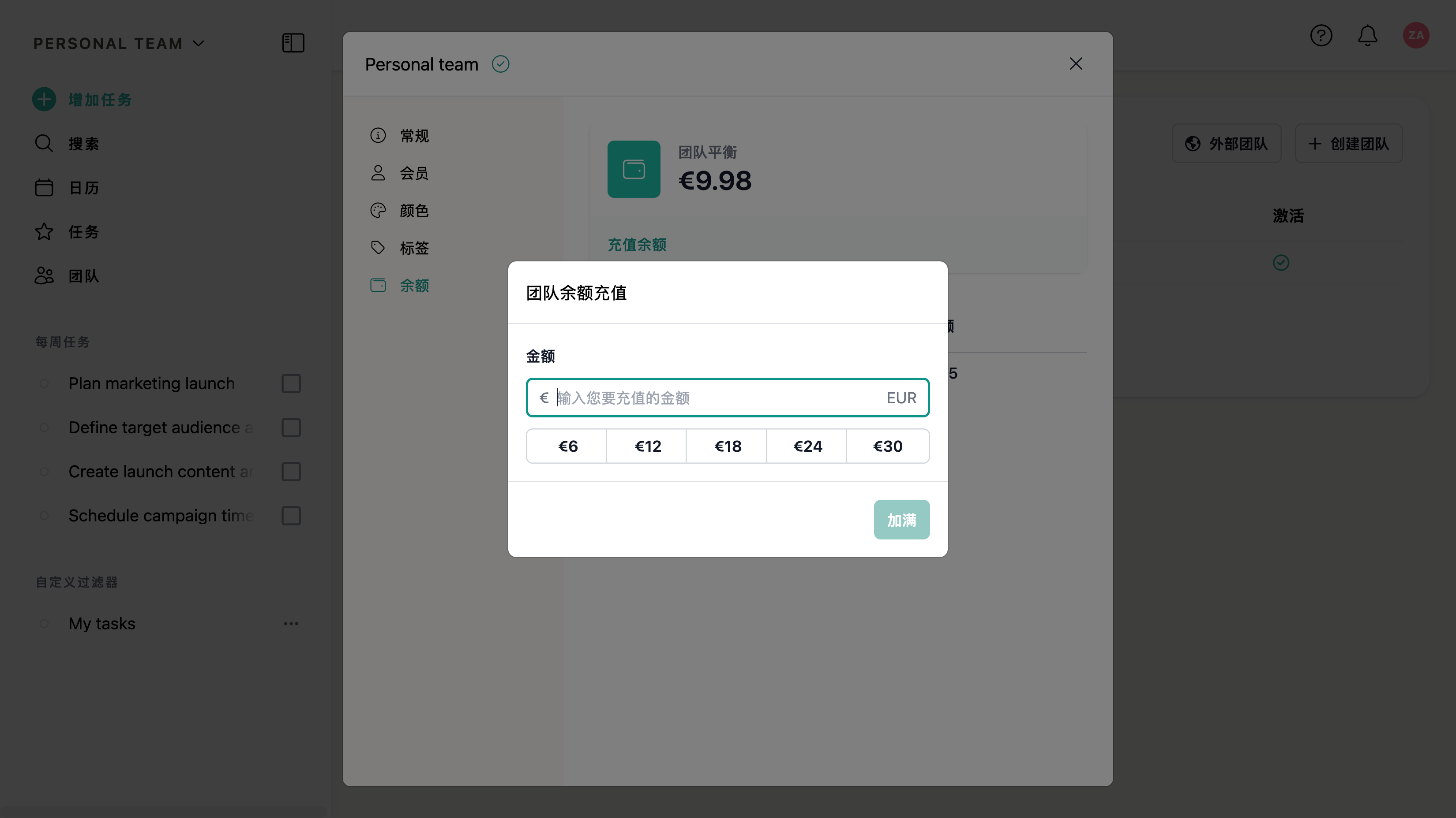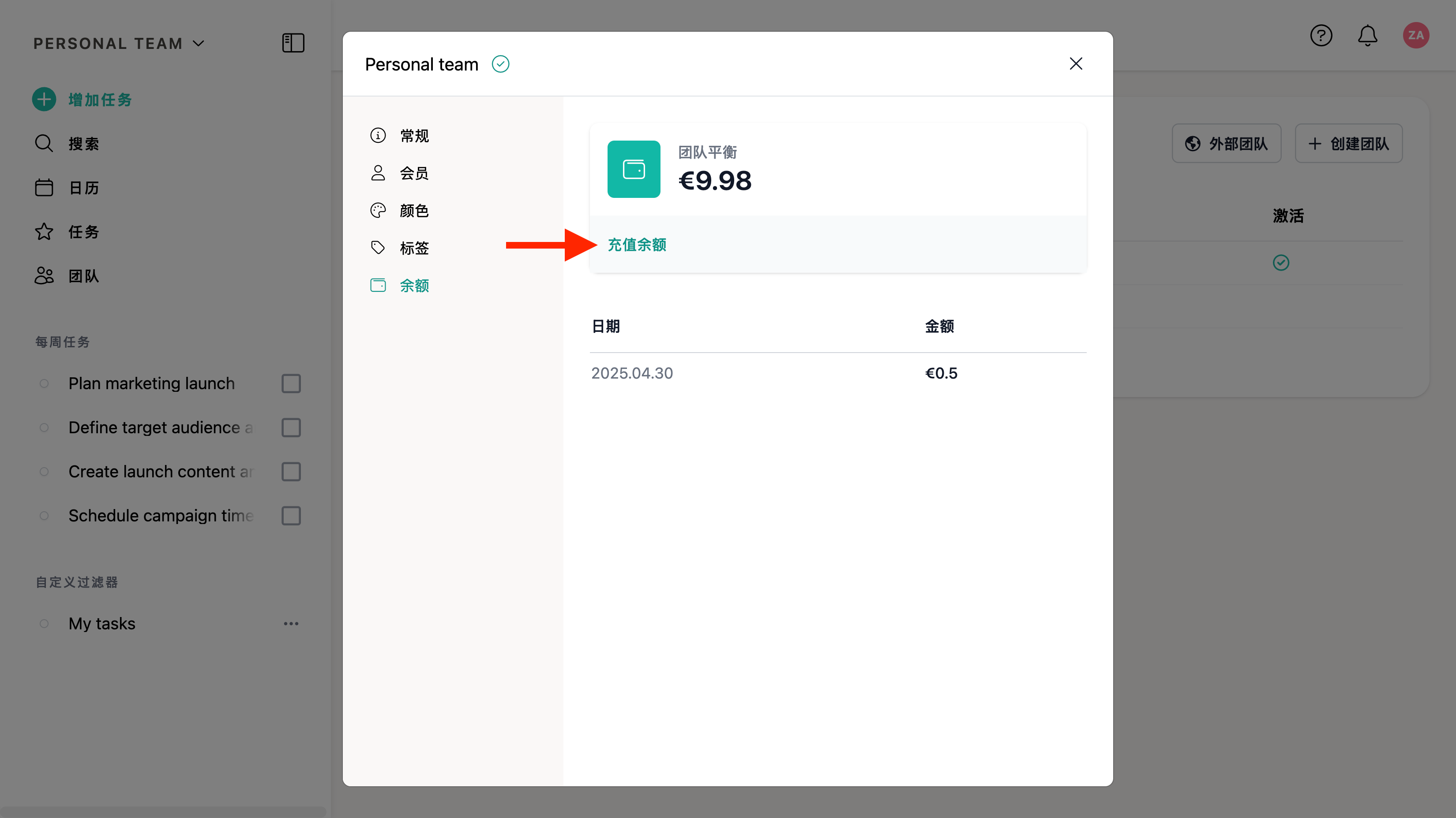 要查看或管理团队余额,请点击侧边栏中的 团队 进入团队页面。